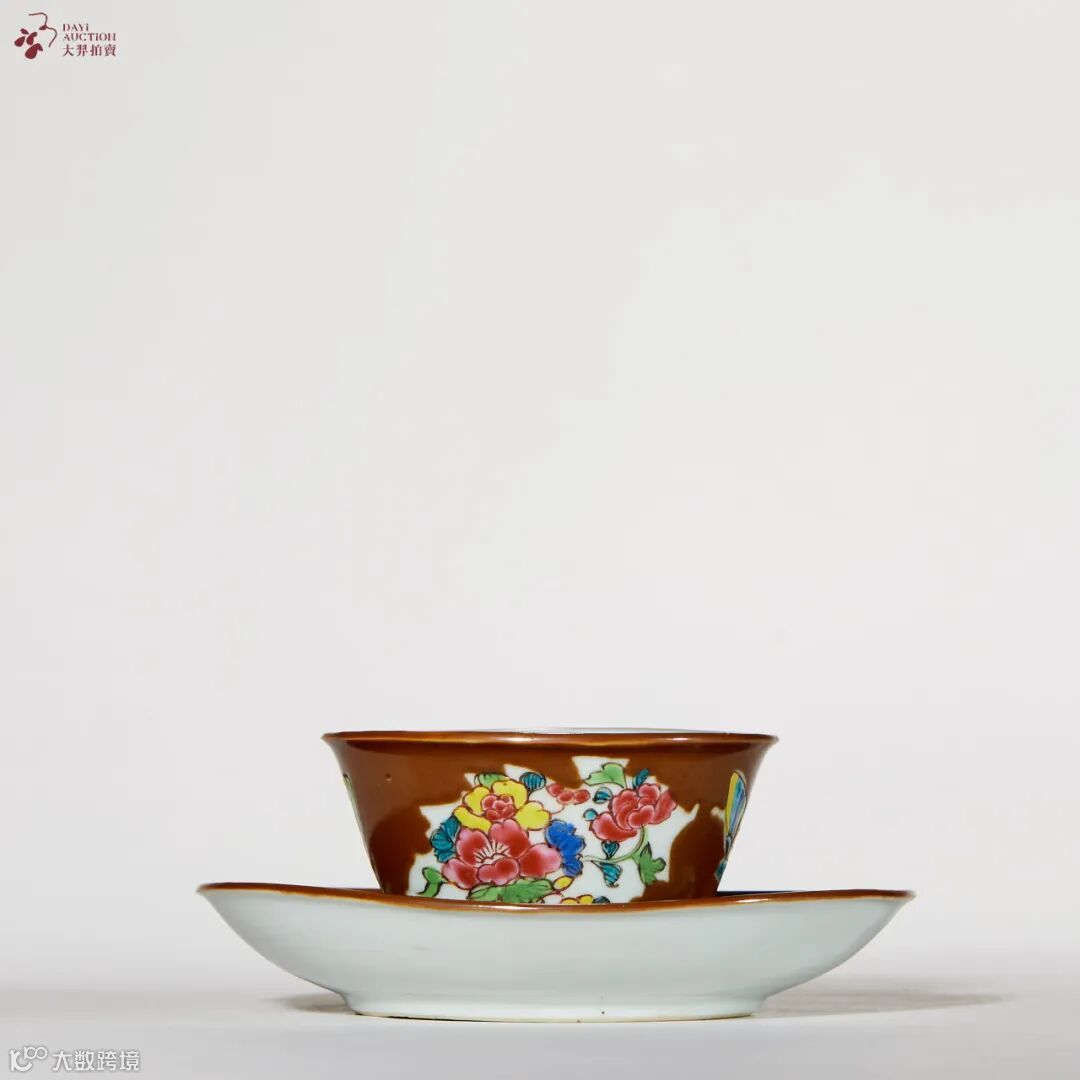 清雍正 外紫金釉内粉彩花卉蝴蝶纹杯碟