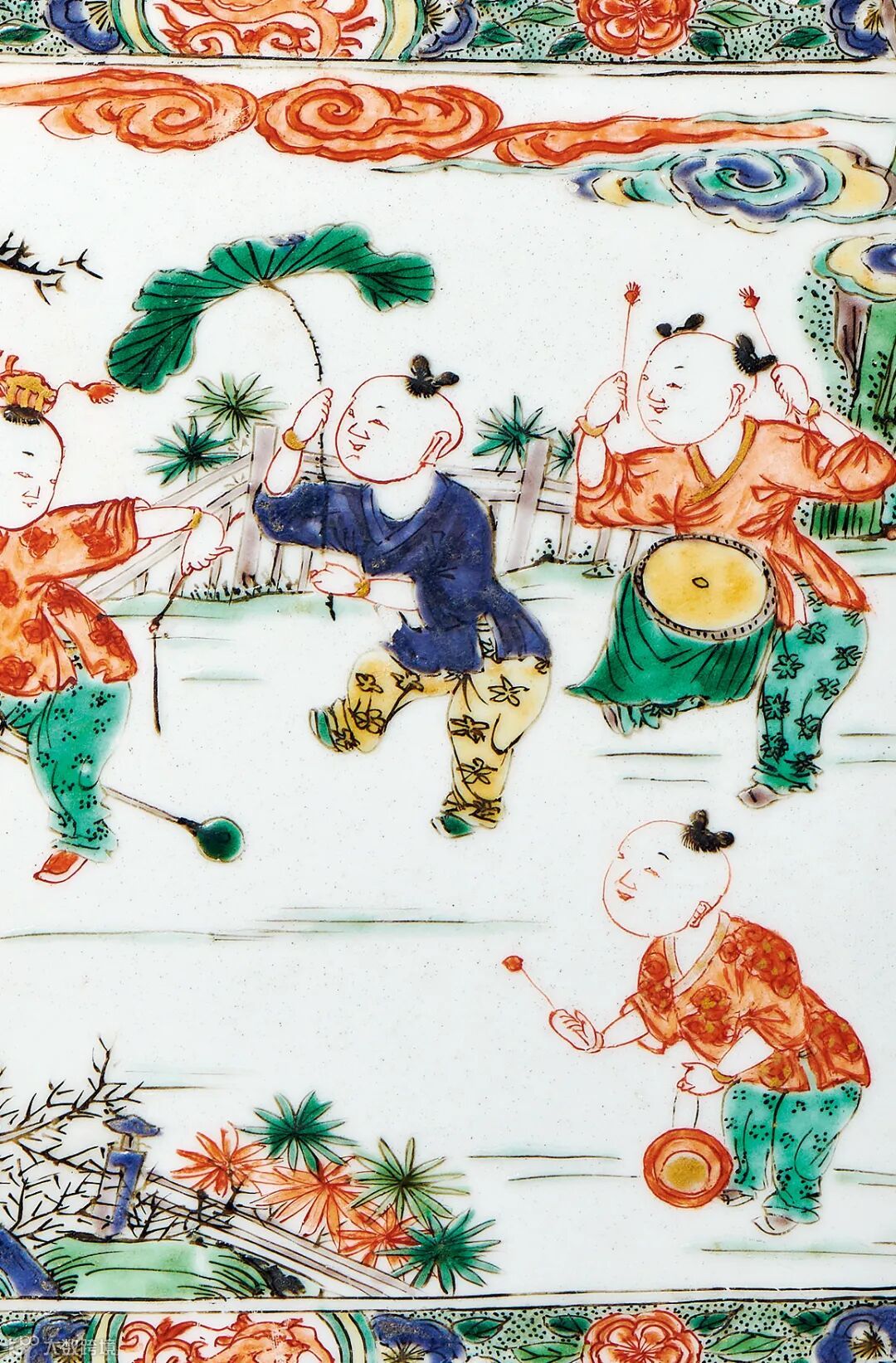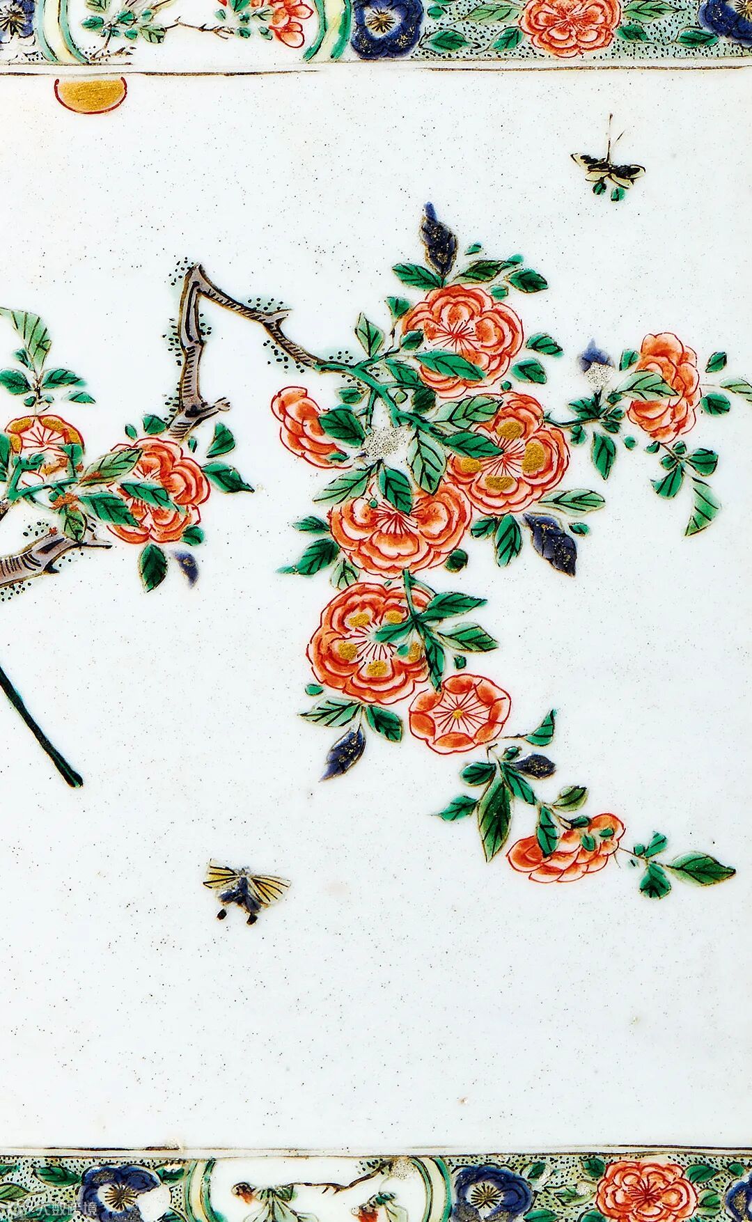 “康熙五彩”,又名“康熙硬彩”,在己烧制好的瓷器上,以红、绿、黄、蓝、黒等多种釉上颜色绘制画面,再经800—900℃左右火烧而成。之所以康熙五彩又称为“硬彩”,这是与雍正粉彩相比较而言。据《饮流斋说瓷》解释:“清代彩瓷变化繁复,几于不可方物。康熙硬彩,雍正软彩。硬彩者,谓彩色甚浓,釉付其上,微微凸起也。软彩,又名粉彩,谓彩色稍淡,有粉匀之也。”五彩色料助溶剂少,因色彩深厚堆探,鲜明透古彩色料,宛如LOT70 清康熙 铜胎嵌五彩喜鹊登梅婴戏图瓷板四方花盆给人利落明快之感。