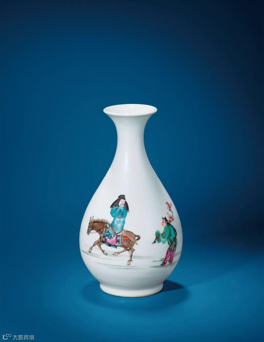 拍品为葫芦瓶制式,秀气挺拔,造型饱满,胎体细白坚致,釉面光亮匀净,笔法生动遒丽,构图疏朗清逸,设色清新雅丽。葫芦瓶上半部分以两组博古图装饰,腹部通景绘踏雪寻梅图,二位高士骑驴,身后童子相伴,肩扛梅花枝束,身后一株老松虬然而立,意境清幽深远,文人雅士清贵之气满溢。全器用料考究,色彩浓艳,行笔老辣爽利,表情刻画生动,层次分明,立体感强,为康熙朝少见五彩佳作。