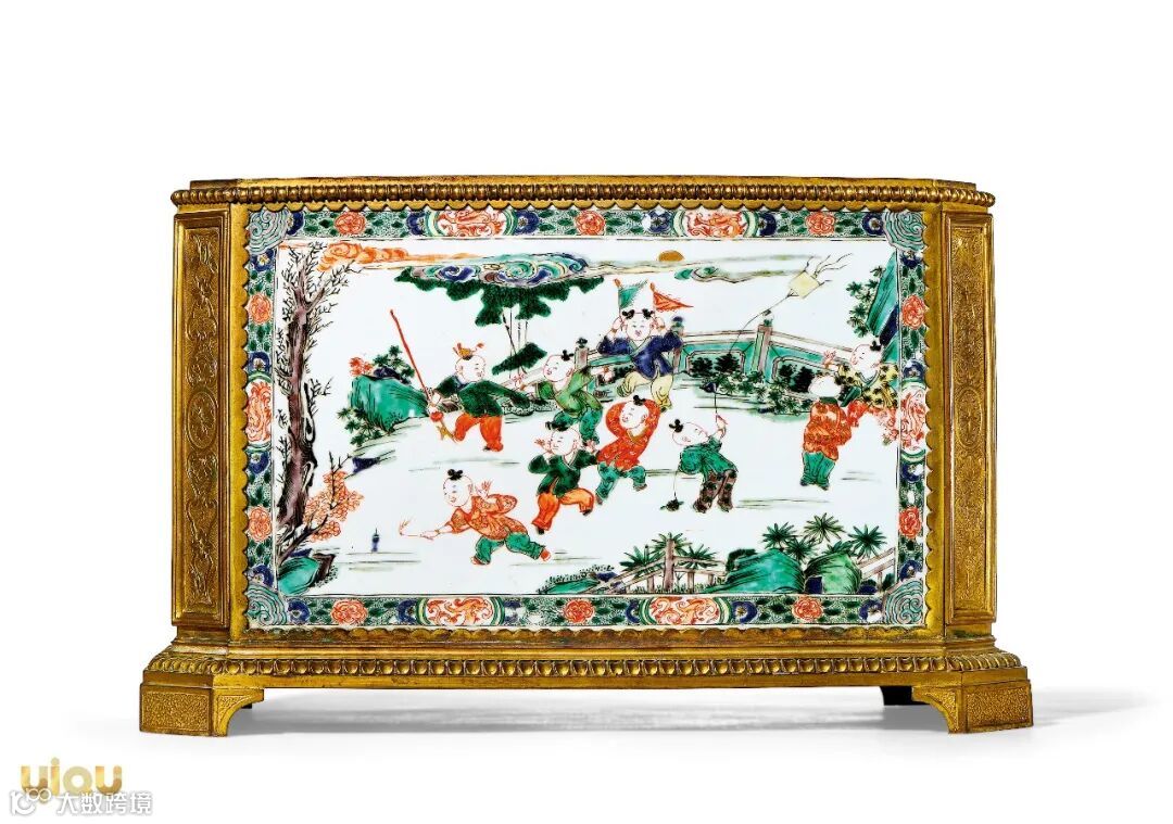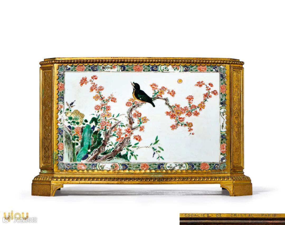 拍品四方形制,轮廓取精铜为胎,鎏金华贵;四面分别嵌以瓷板,其上绘五彩婴戏、喜鹊登梅等吉祥纹样,寓意“多子多福”、“喜上眉梢”、“探花及第”。整器设色明快艳丽,纹饰生动传神,意趣十足,五彩纹样衬以鎏金铜胎,古朴雅致,风格别具。铜座边缘铭刻“ESCALIER DE CRISTAL PARIS”。