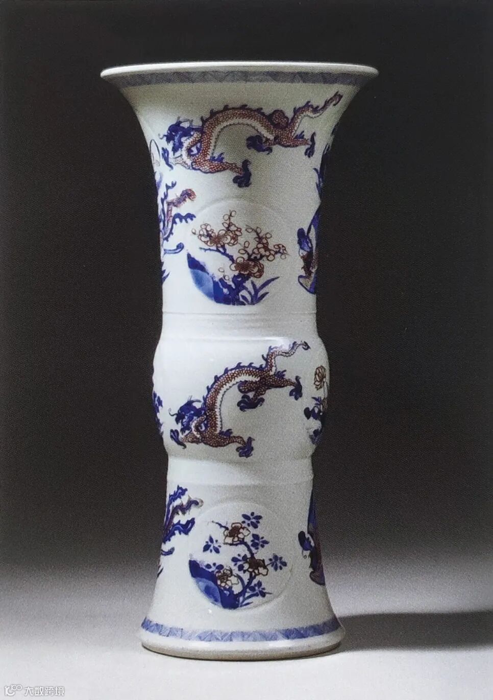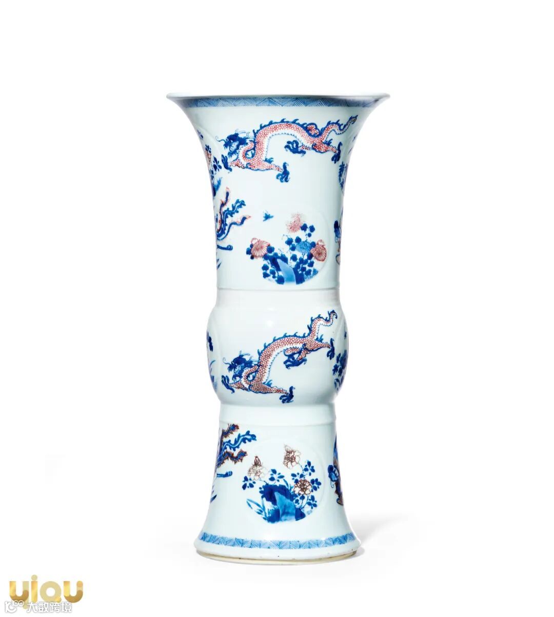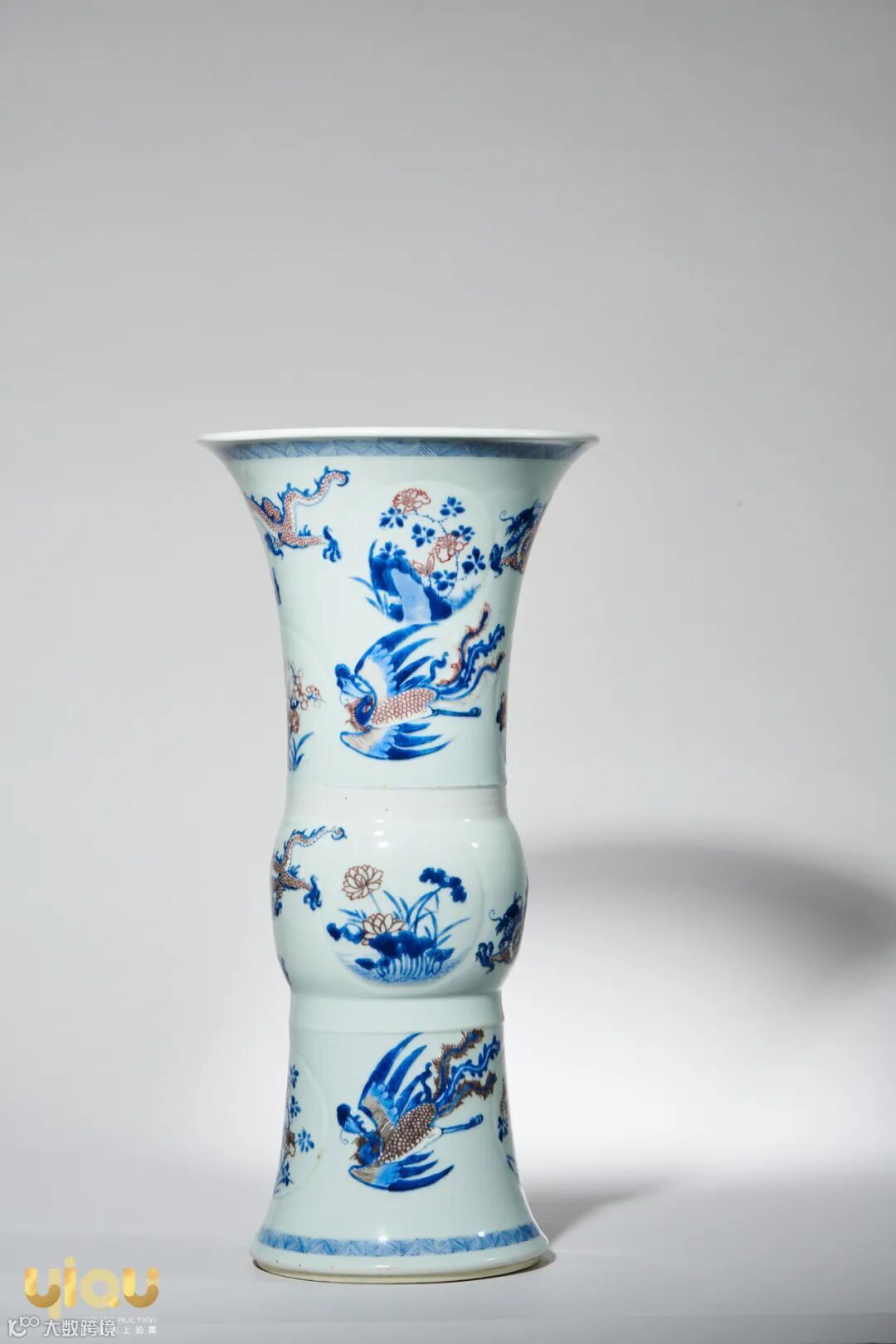 拍品撇口,粗长颈,腹微鼓,高足外撇。觚为青花釉里红制器,较为少见。青花与釉里红由于二者性质的不同,以及对烧成温度、窑室气氛的要求也有差异,故青花釉里红施于一器且呈色均匀恰到好处十分之难,历代烧制不多,传世品少见,至清代康熙时由于国力强盛才有所发展。此花觚绘龙凤纹,龙张牙舞爪,双角向后伸展,龙身卷曲,腾飞游动,刚劲有力。此器胎质细腻,青花发色层次分明,色调平和,红彩深红艳丽,釉面莹润,具有清康熙朝时期的典型时代特征。