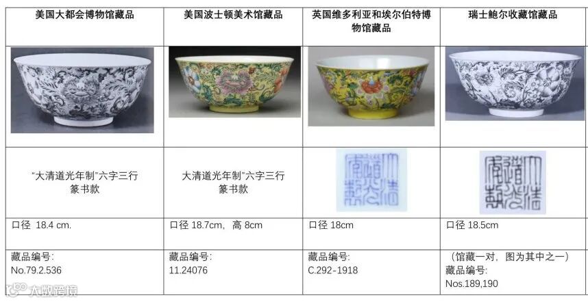 道光时期黄地洋彩洋花五福宫碗于全球各大馆藏中数量相对较少,相类者可见五例。分别为藏于美国大都会博物馆,美国波士顿美术馆,英国维多利亚和埃尔伯特博物馆,瑞士鲍尔收藏馆,景德镇陶瓷馆藏。