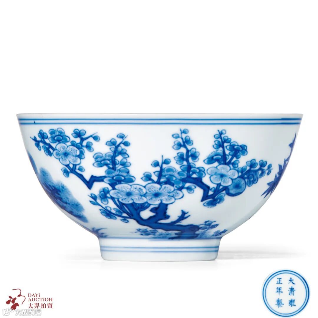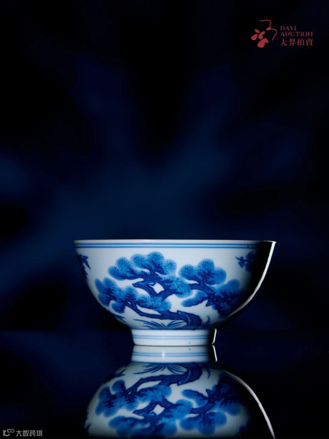 碗口微撇,弧腹,圈足。通体施透明白釉,口沿及近足底绘弦纹两周,碗壁分别绘松、竹、梅三友,碗心双圈绘云纹十字,足内青花双圈书“大清雍正年制”楷书款。此种碗式为清代御窑传统制式,自康熙至宣统均有烧制,传世品以雍正者至珍至稀。本品胎薄体轻,釉色纯净,青花淡雅,画工精致,颇具成窑之品质。雍正时期制瓷风气之严肃认真非其他朝代可及,胤禛严谨得近乎苛刻审美在瓷器烧造上展现无遗,精致、清雅、隽秀是雍正瓷器的风骨。