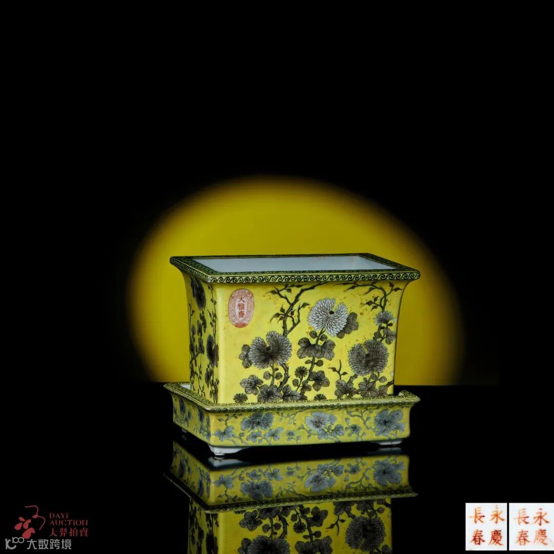 菊花是中国十大名花之一,同时也是四君子之一,在中国已有三千多年的栽培历史。更有吉祥,长寿的含义。本场还征集到一件LOT142 清光绪黄地墨彩花卉纹盆奁一套,皆以鹅黄为地,其上墨彩绘秋菊纹,花朵娇艳盛开,叶脉、花蕊绘制细腻,诸物置于一景,相得益彰。