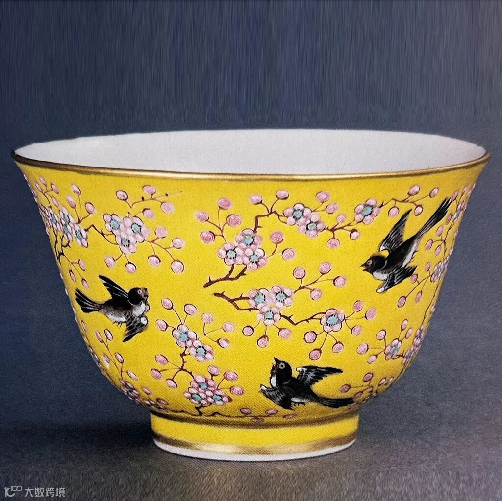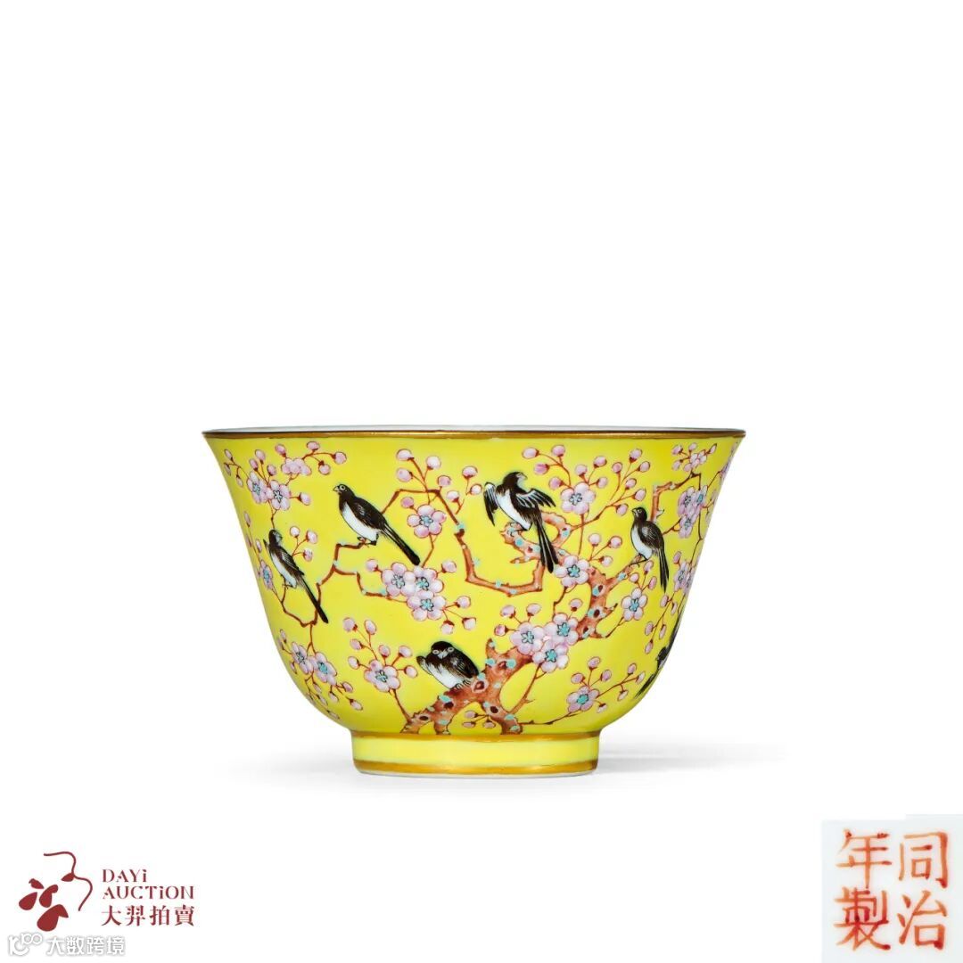 在LOT139清同治黄地粉彩喜上眉梢图杯的瓷壁上,梅枝簇簇,有鹊登梅。在中国传统文化中,喜上眉梢和百喜临门都是非常吉祥的意象,它们代表着喜悦、幸福和美好的未来,被广泛应用于织锦、书画、瓷器、铜器、木雕、剪纸等多种器物当中。而当这两个美好的意象在瓷画中得以展现时,更是一种艺术的享受。