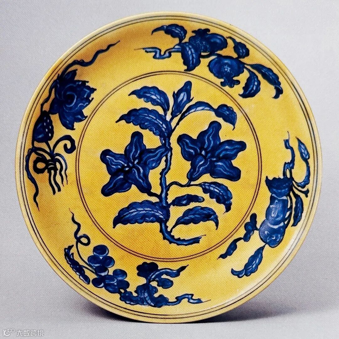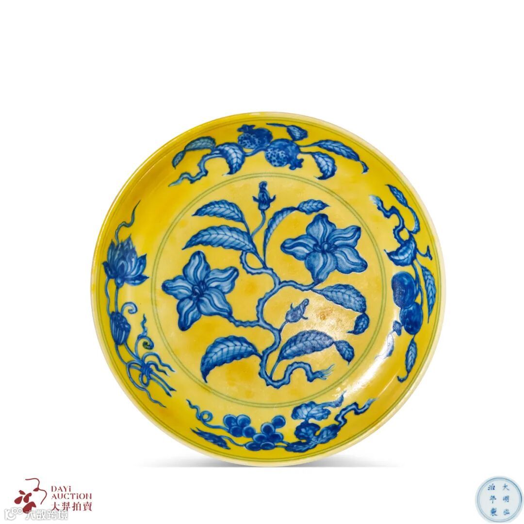 本品整体图案以莹亮娇嫩的黄釉为地,青花绘制图案,盘心绘一枝栀子花,两朵五瓣花正盛放,顶端还绘有一含苞待放花蕾,生机盎然。内壁饰柿子葡萄莲花和石榴,外壁上下双圈内绘一圈缠枝芙蓉。底施白釉,中心青花双圈内书“大明弘治年制”六字双行楷书款。