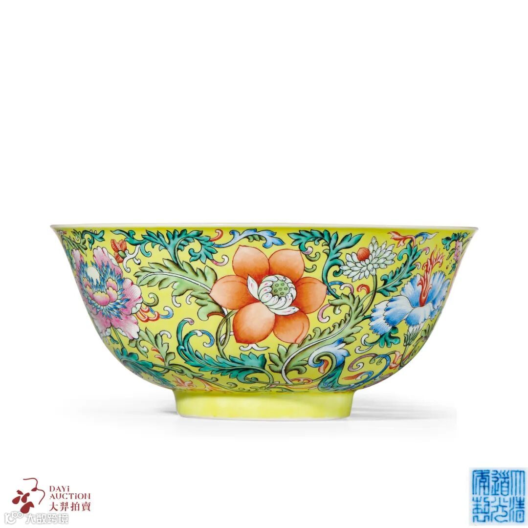 此件拍品外壁绘黄地粉彩缠枝花卉纹,花叶卷曲繁茂,花色鲜艳华贵,绘工精致,富有强烈的立体感。纹饰、绘画风格、施彩、构图技法皆源于西洋艺术,巧妙运用西方绘画中的明暗法,以亮点并调合白彩绘花瓣、叶片之亮处,有明显的珐琅彩效果,体现出欧洲巴洛克装饰风格对中国美学的影响。北京故宫博物院研究表明:“……此种碗清宫内务府造办处档案称为‘洋彩黄地洋花宮碗’,乾隆二年时已开始大量烧造”