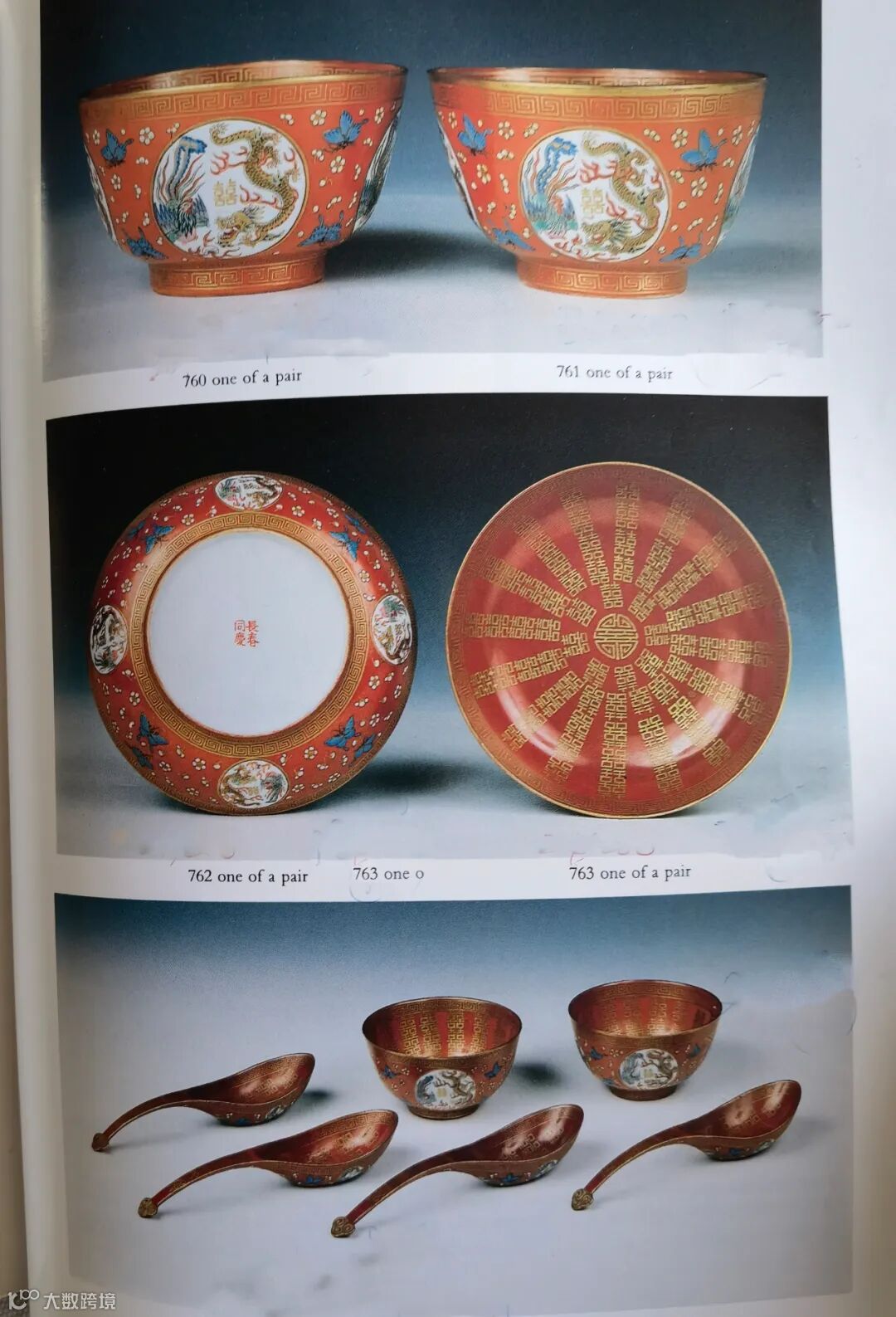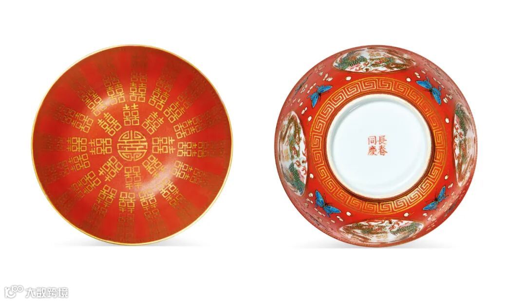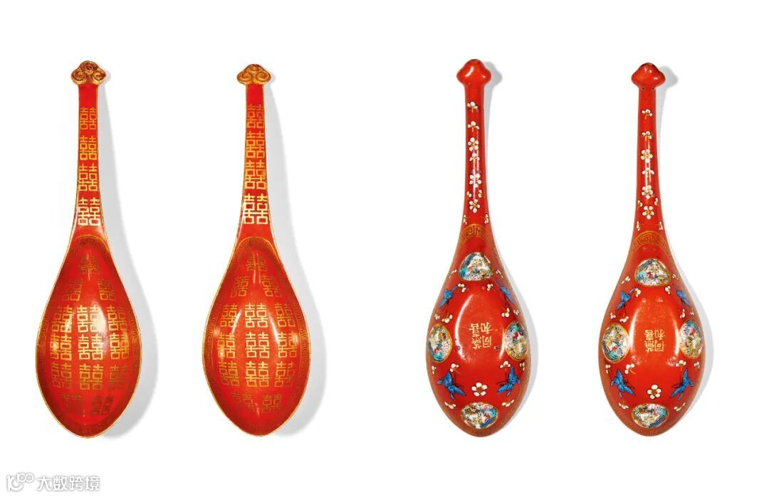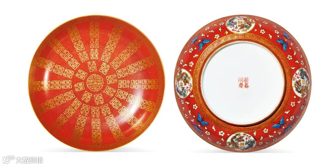 LOT851 清同治 珊瑚红地描金开光粉彩龙凤喜字纹盘、碗、匙(一套六件)