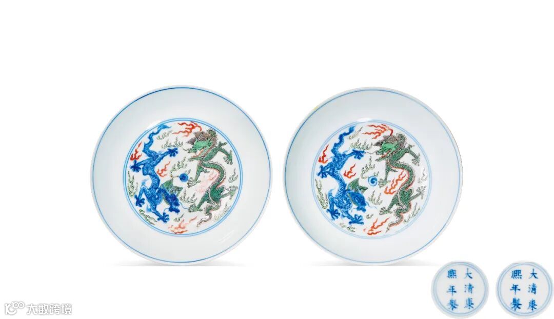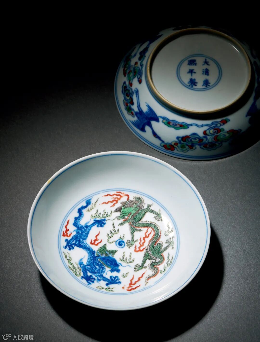 盘心双圈内绘双龙戏珠图,双龙叱口突目,长髯飘拂,不怒自威,气势磅礡。外壁以斗彩工艺绘云鹤纹,采用“点彩”技法,仅以一星红彩点于鹤头。仙鹤于五彩祥云间飞舞,凌霄直上,仙姿迭现,一派轻灵秀逸之韵。整器别致,苍古、雅逸兼具共存,悦目怡情,沁人心扉。底部青花双圈楷书“大清康熙年制”双行六字款。