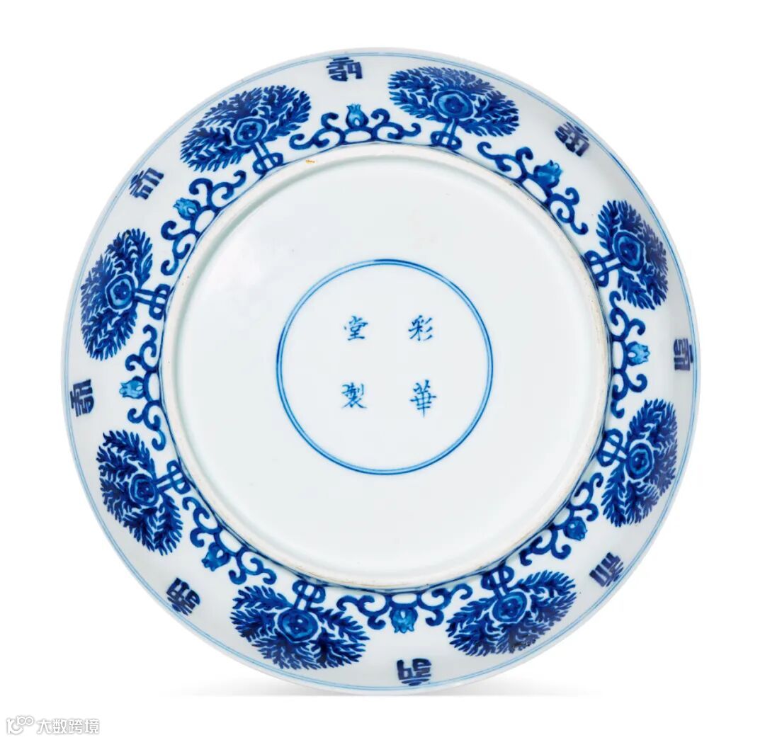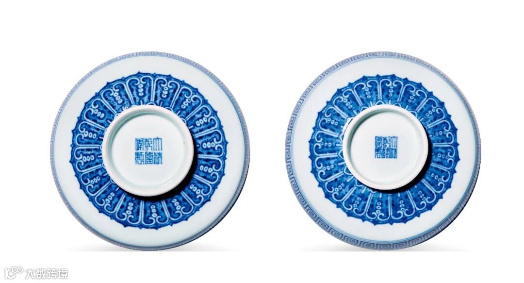 LOT854 清乾隆 青花缠枝佛花梵文盘一对外壁绘青花缠枝佛花,留白处书梵文,字体清秀。内壁口沿处绘细密梵文,排列工整,苍劲有力。盘心主体亦绘五组青花缠枝佛花纹,青花缠枝佛花纹及梵文皆为藏传佛教传统装饰纹样。