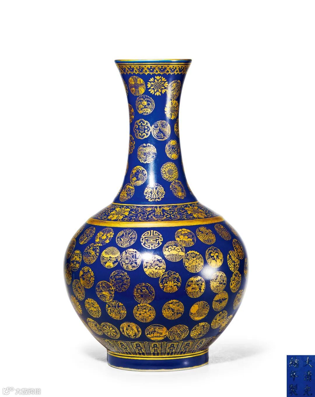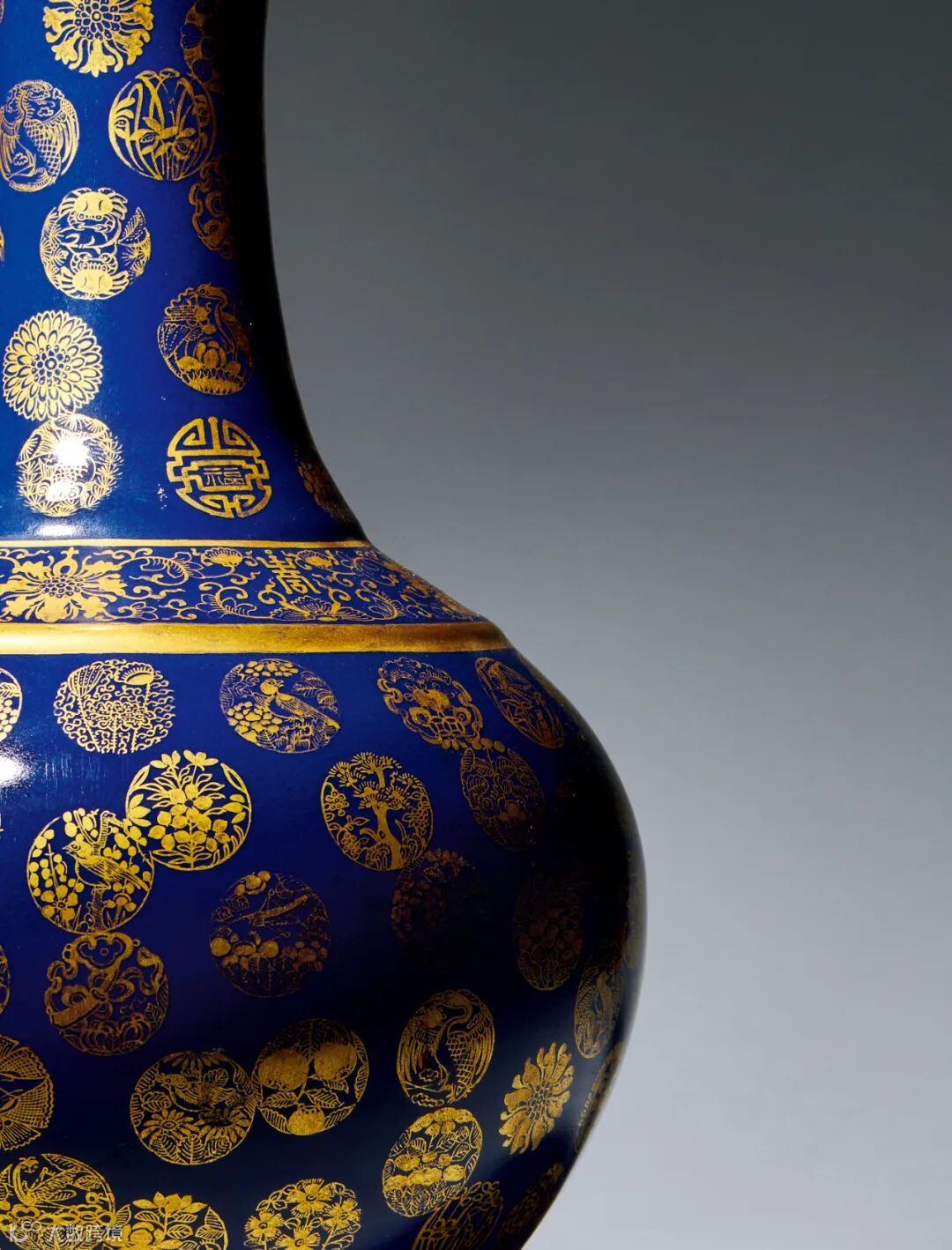 瓶身通体施霁蓝釉为地,浓艳深沉,釉面润透。其上描绘各式花样的金彩皮球花,金彩艳丽,尽显祥瑞吉庆,布局匀称,线条细腻流畅。口沿、肩部、胫部分饰如意纹、缠枝花绘纹、莲瓣纹。整器造型规整,绘工精巧细致,纹饰华丽,金彩绚丽,霁蓝庄重静穆,交错相映,有富丽堂皇之感。此种赏瓶器形为赏赐之用,是雍正朝出现的一种新型瓷器品种,据《清档》(雍正记事杂录)载:『雍正八年十月奉命再将赏用瓷瓶烧造些来』,久而久之称『赏瓶』,此种造型历代均有烧造,成为传统的官窑瓷器品种。