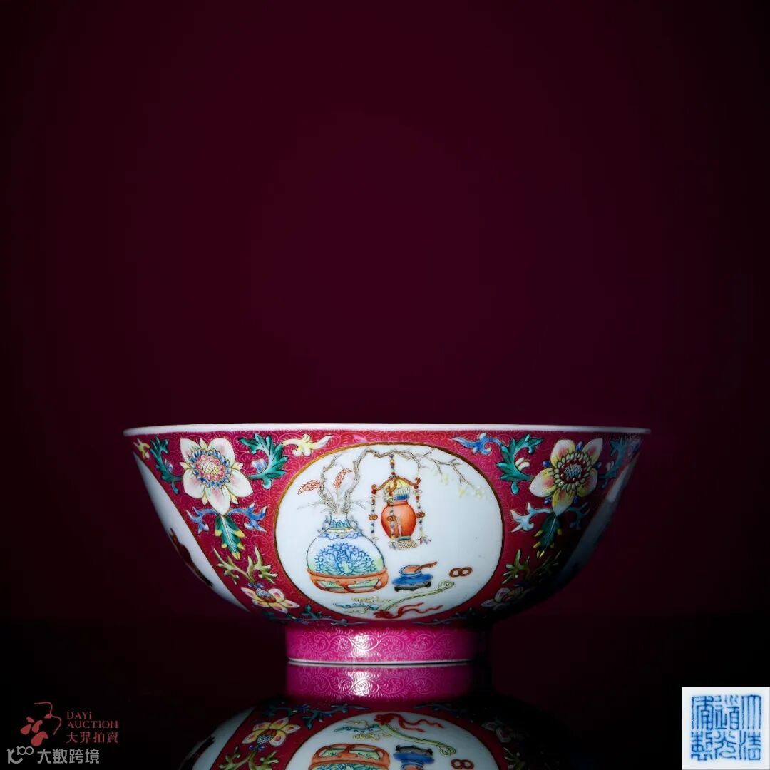胭脂红地粉彩轧道开光五谷丰登图碗
