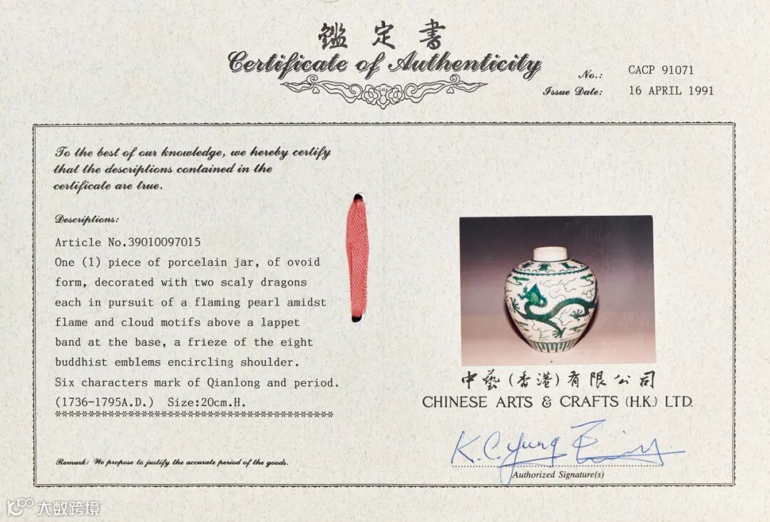 来源:香港中艺,1991年4月16日(附鉴定证书)