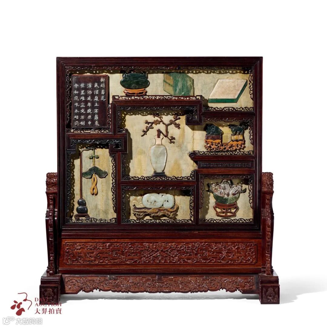 紫檀百宝嵌菊花博古图御题诗插屏