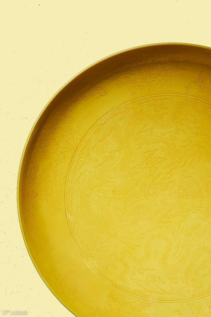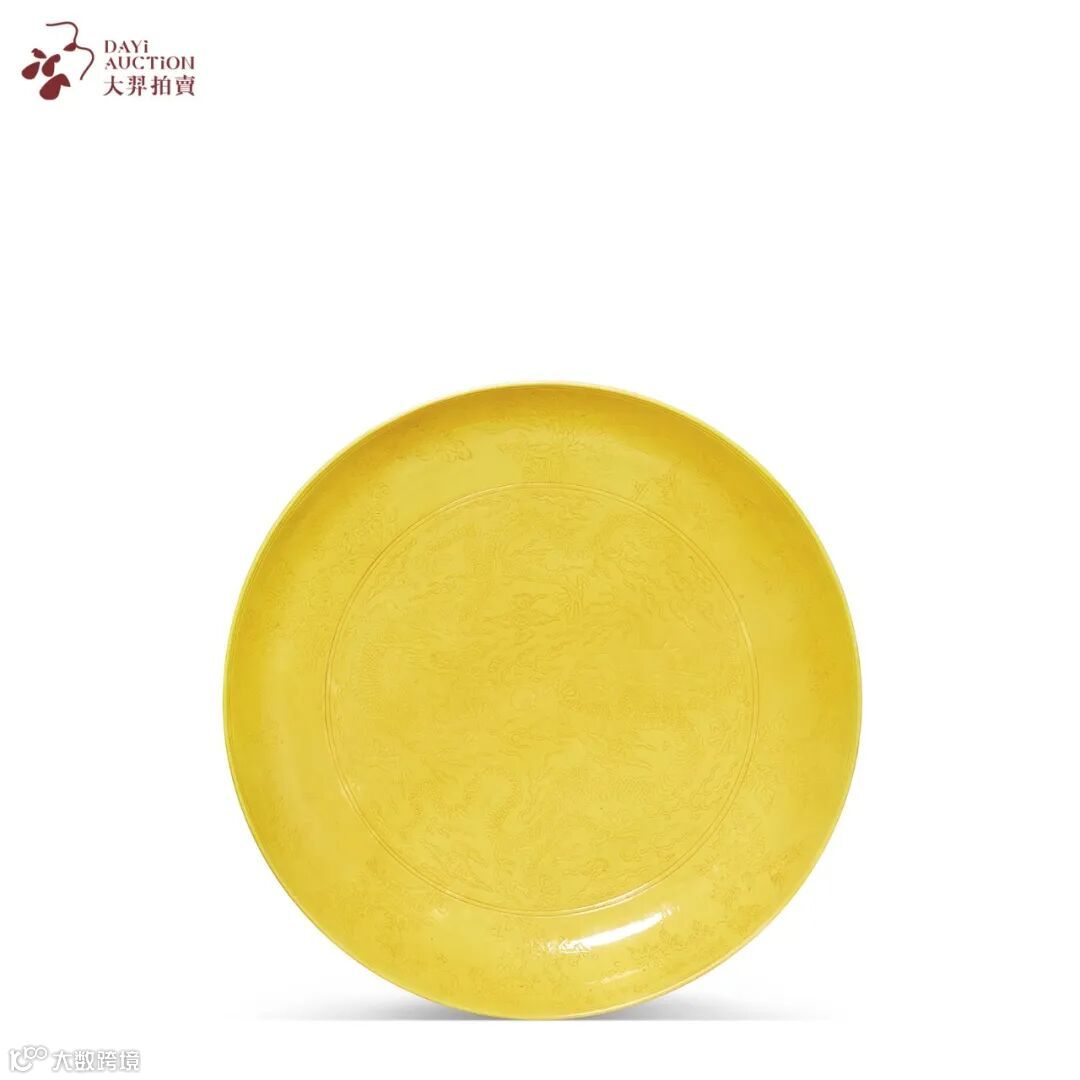 此盘敞口,弧腹,圈足,拍品盘形周正,造型端庄。内外通施黄釉,釉色娇黄亮丽,淡雅柔和,色泽清朗。内壁暗刻折枝四季花卉纹,线条流畅,气势遒劲。盘心及外壁暗刻二龙戏珠纹,龙纹苍劲威严,刀法细腻纯熟,收放自如,是为雍正朝黄釉瓷器中至佳至美者。器底施白釉,中心青花双圈内书“大清雍正年制”六字双行楷书款。《陶成记事碑》记有:“雍正十三年(1735年),一仿浇黄器皿,有素地、锥花两种……” 按其品目,拍品即为此类器皿。“黄”与“皇”同音,因而黄色也成为皇家至尊之色。《国朝宫史》曰:“内外皆黄者,唯帝后用。”黄釉者,后世均以弘治为楷模,雍正黄釉发色明快,色泽更胜弘治一筹。本品于台北故宫博物院收藏有同类作品,可为参照。