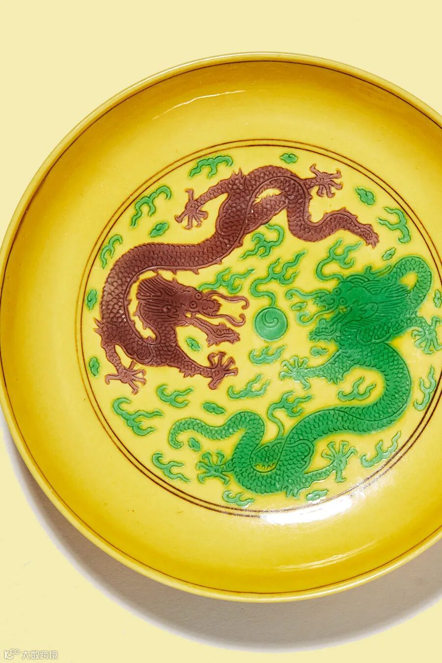 盘敞口,弧壁,圈足,盘形规矩周正,精巧可爱。通体以黄釉为地,盘心双圈内以釉下暗刻双龙赶珠纹,然后分别以赭彩、绿彩分别填饰龙纹,所刻龙纹方额宽头,线条老辣苍劲,尽显苍龙的风范。外壁暗刻凤纹及云纹四组,凤纹姿态各异,填饰绿彩。纹饰刻划精细,黄釉莹润亮泽,紫绿彩色调深沉。器底落“大清乾隆年制”赭彩篆书款,此类黄地赭绿彩龙纹盘首见于万历御窑瓷器,清代历朝沿袭烧制,成为清代官窑瓷器的经典品种,此盘色彩明艳,釉光莹润,质量之精殊为难得。