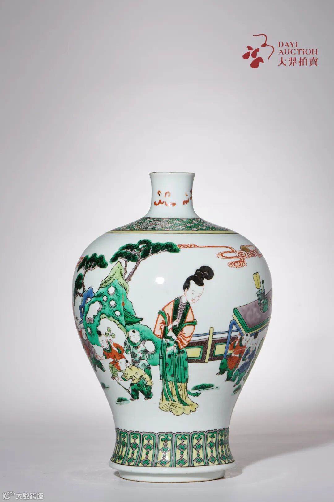 拍品造型纤秀雅致,起线流畅,瓷胎细密,釉色温润,腹部通景以五彩绘仕女婴戏图,庭院石台有画筒、书函,仕女或站或坐,发髻高挽,面庞纤丽,眉清目秀,其旁童子笑眉颜开,玩闹嬉戏,相迎雀跃,场景生动祥和,五彩浓艳绚丽,可堪玩味。以仕女婴戏为题材,寓意多子多福,极具喜庆祥和之感。