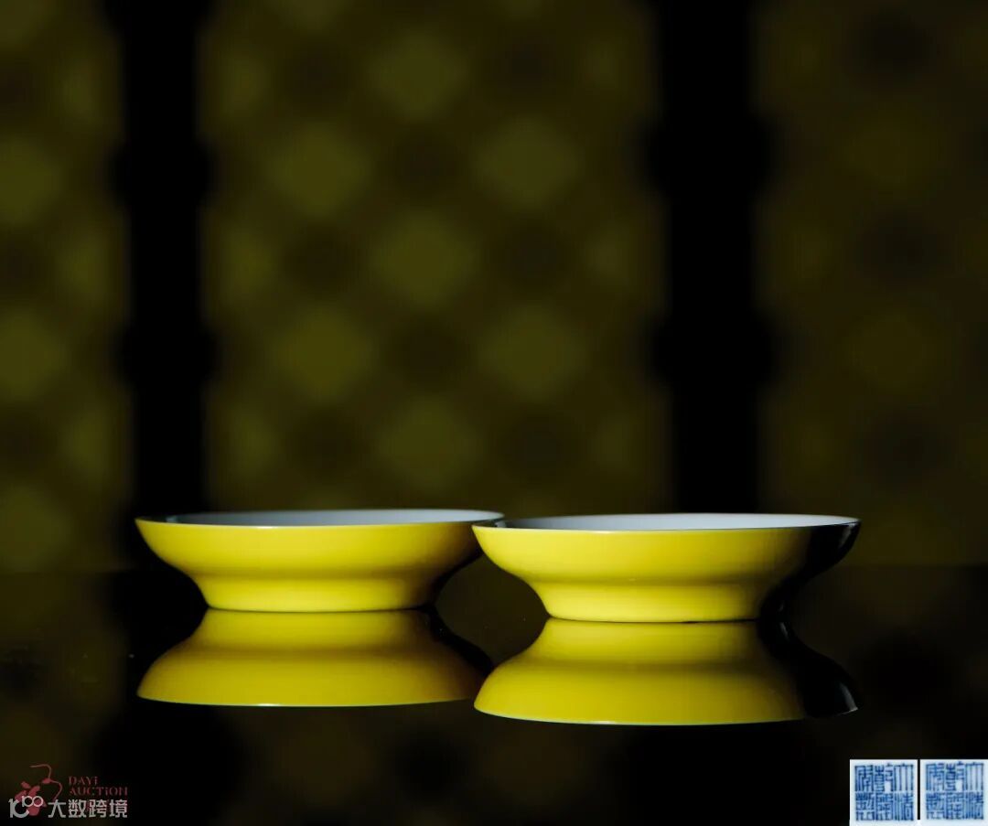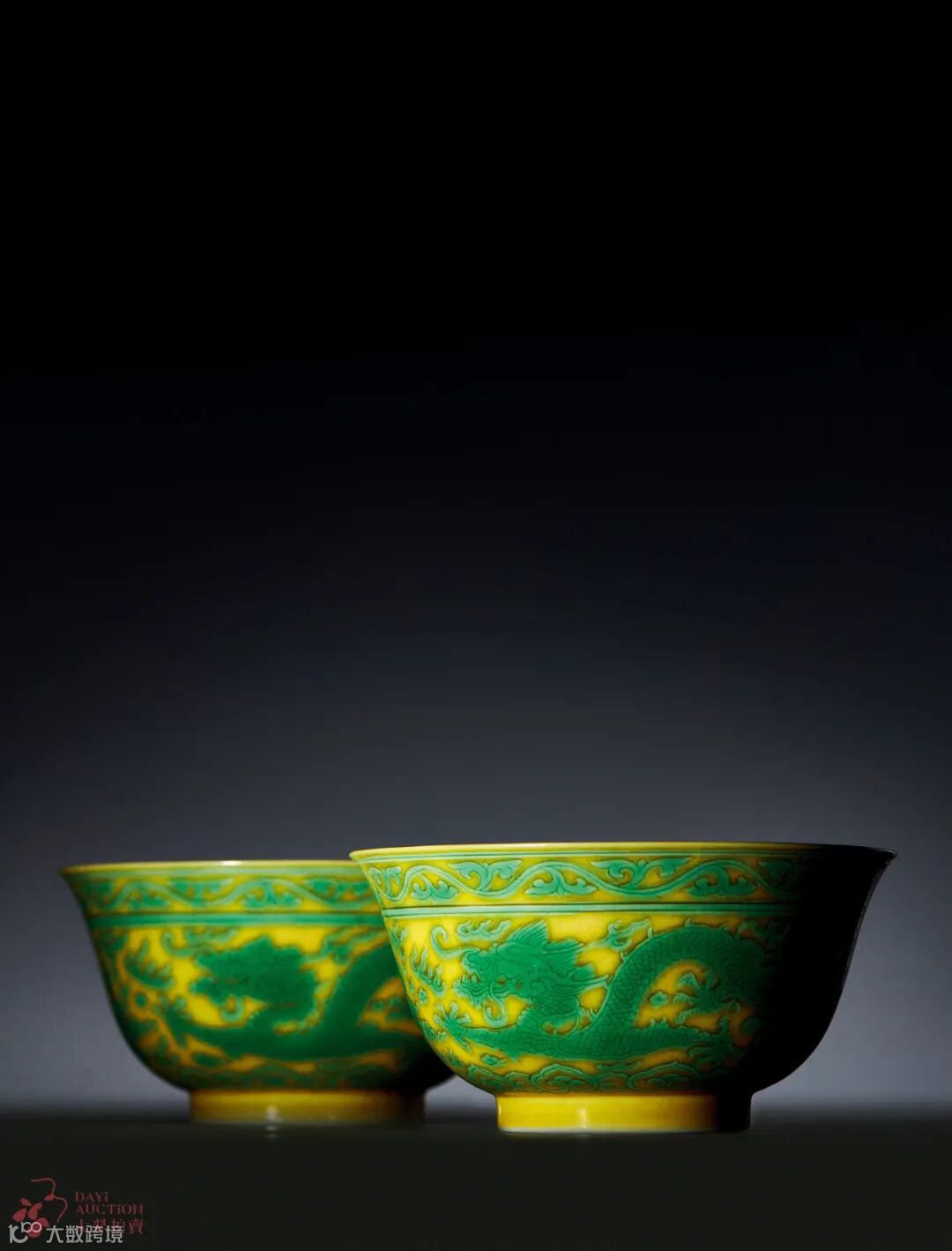 LOT.650 清乾隆 黄地绿彩云龙纹碗一对