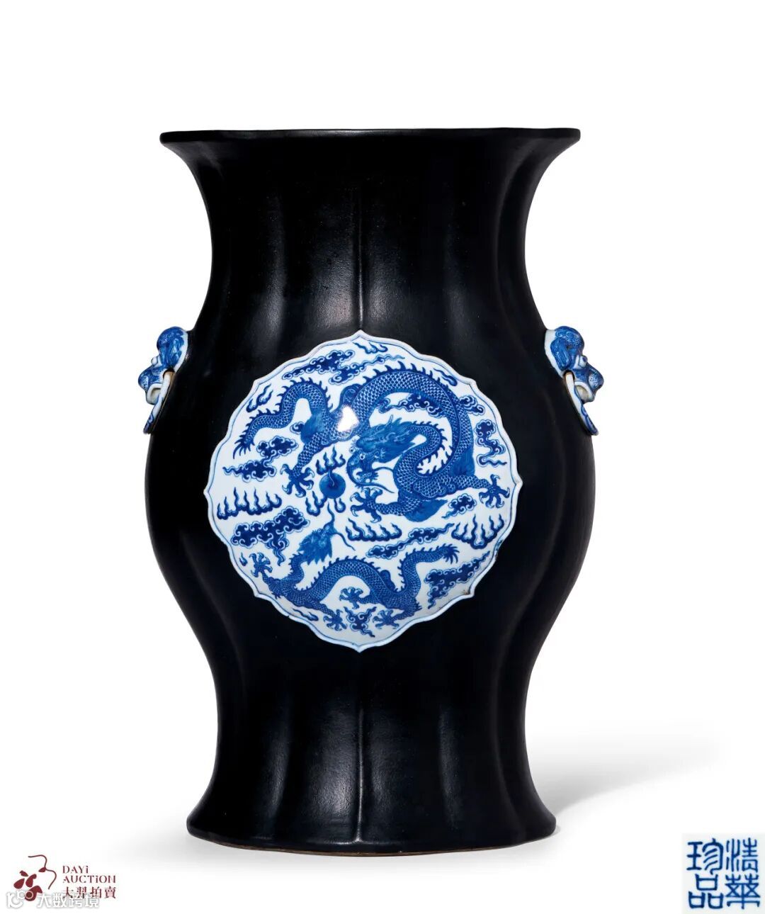 LOT.60 清光绪 黑釉开光青花苍龙教子纹铺首耳花口尊