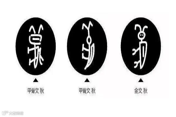 “秋”是个会意字,本意是成熟的庄稼,甲骨文的“秋”,字形就像一直蟋蟀,古人发现蟋蟀一般在秋天鸣叫,所以就借此表达秋天的概念。