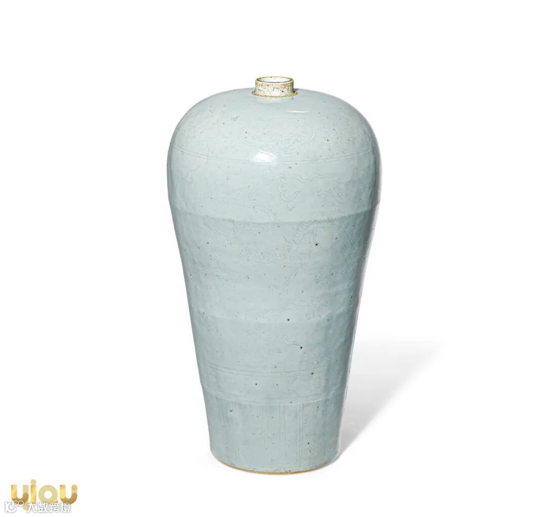 此件梅瓶通体施白釉,色泽纯美无瑕,外壁以釉下暗刻工艺装饰,丰肩饰如意云头纹,足胫处饰变形莲瓣纹,腹部主体纹饰为双龙穿梭于祥云之中追逐龙珠,身形矫健,为典型明代嘉靖时期风格。因施釉釉层凝厚,纹饰若隐若现,别有意趣,须近观审视或借光线透视方可得其全貌。