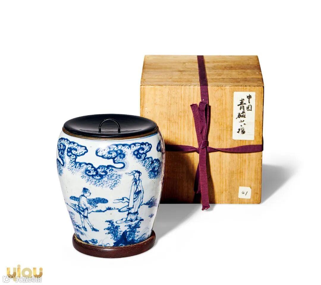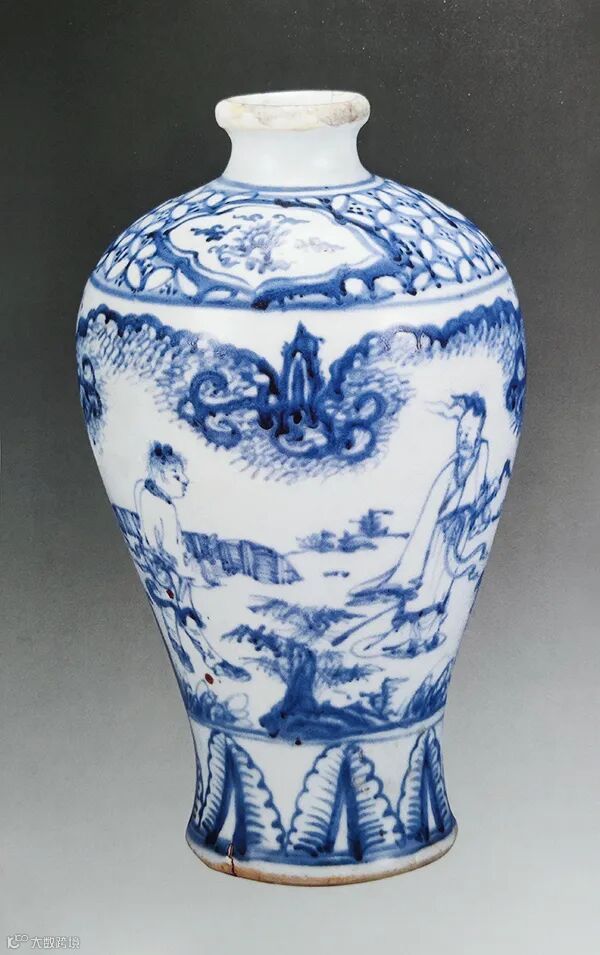 青花水指,腹部主体通绘携琴访友人物故事图,一高士逆风而行,衣襟飘逸,神态悠然,一童子怀抱古琴紧随身后,背景装饰松石、小草、云气,其小草松枝画法简单明了,云气呈灵芝形,上有层层圈点密布,这些特征均为空白期时期瓷器所特有。本水指胎体厚重,釉汁肥厚,青花发色浓淡相宜,画面布局疏朗,笔意雄健流畅,画法粗犷大气,是一件空白期的典型器物。