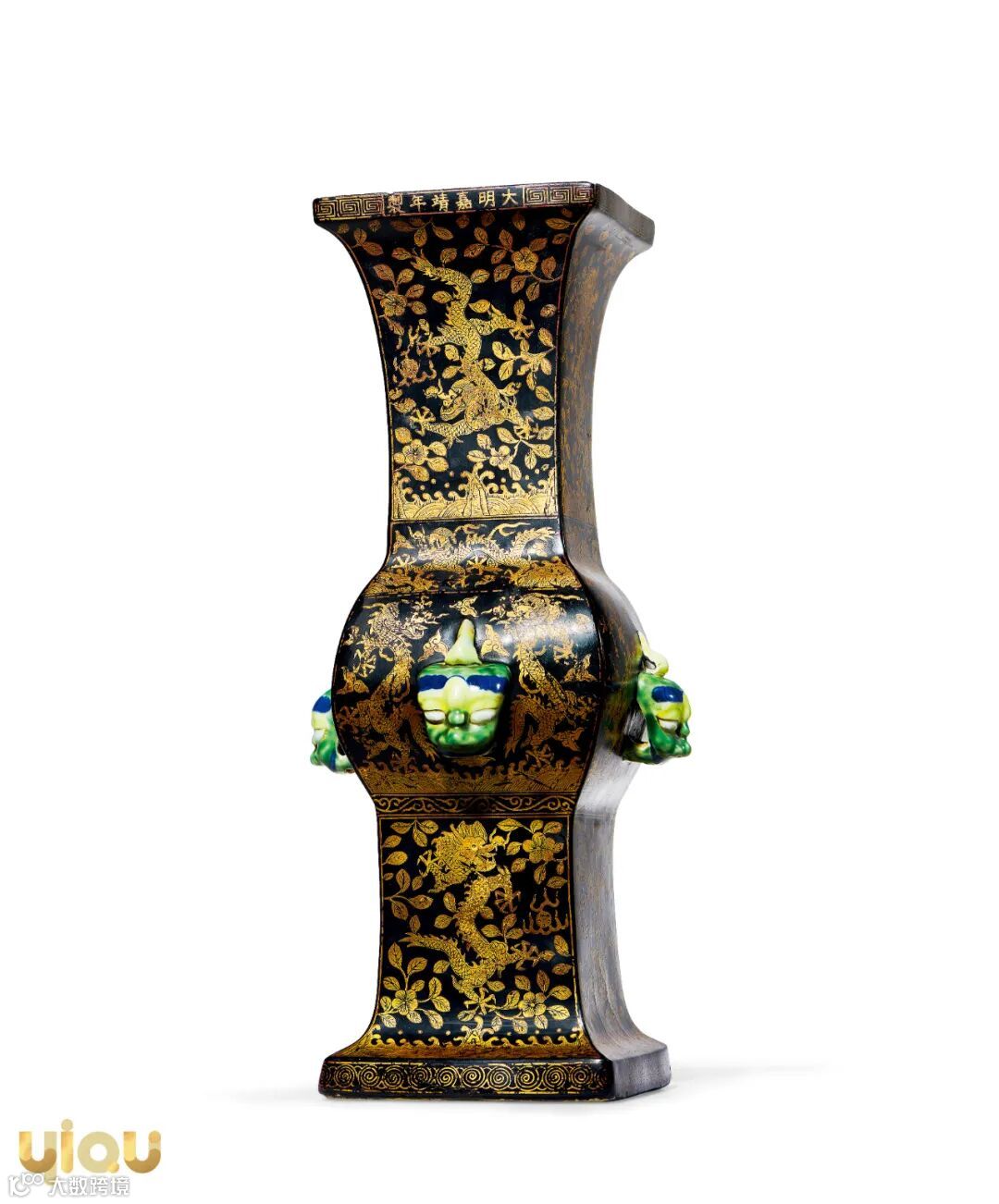 明嘉靖 瓷胎黑漆描金龙纹四方铺首尊