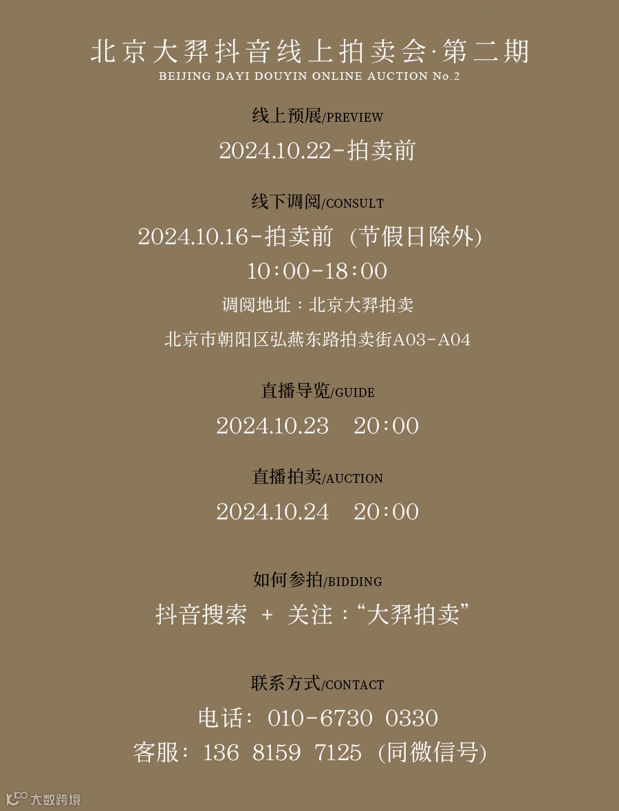 继抖音首拍的圆满成功,大羿第二期抖音拍卖即将乘势开启,「大羿抖音拍」将继续秉持专业、创新、互动的理念,为广大收藏爱好者提供更加便捷、高效的交易平台,带来更多珍贵的拍品和难忘的拍卖体验,让古董艺术在新时代的舞台上绽放更加绚烂的光彩,敬请关注。