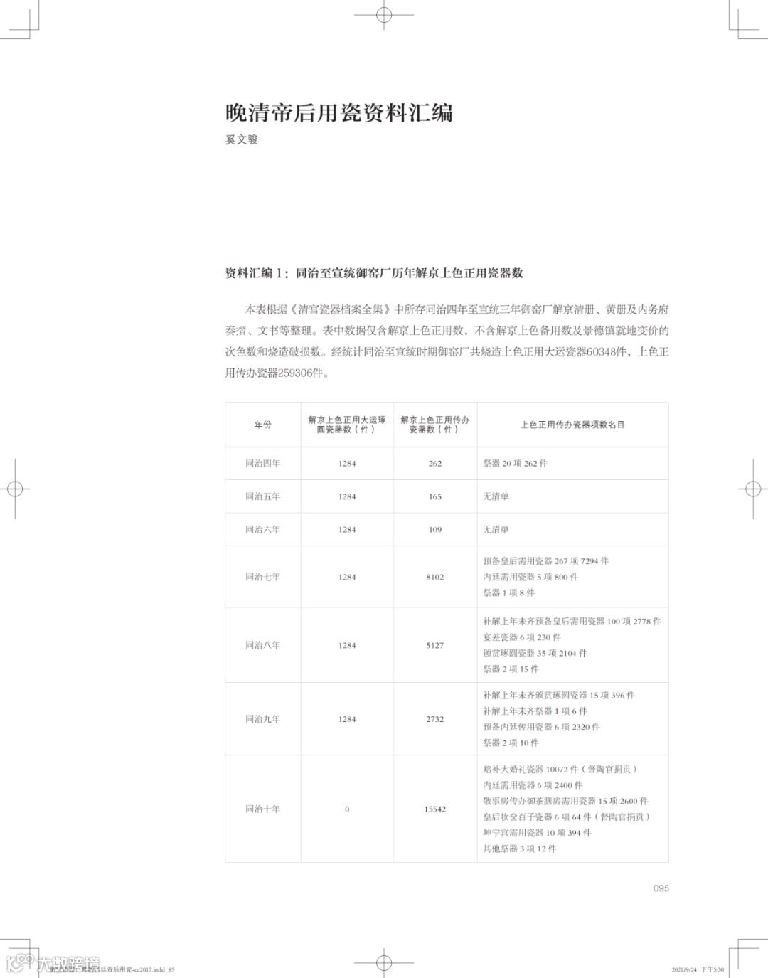 此书还包含有关晚清帝后用瓷4篇论文,分别由故宫博物院赵聪月、张涵、天津市文物交流中心赵磊和明清瓷器独立研究学者奚文骏撰写。内容系统性的为各位介绍了有关在同治大婚瓷前后批次的区分、宫廷采买的大婚瓷、对九种纹样储秀宫瓷器的揭示、光绪大婚用瓷的真实情况及刡头缸的首次披露等方面,所有内容均有研究创新,代表了当前国内外晚清御窑瓷器研究的最新成果。