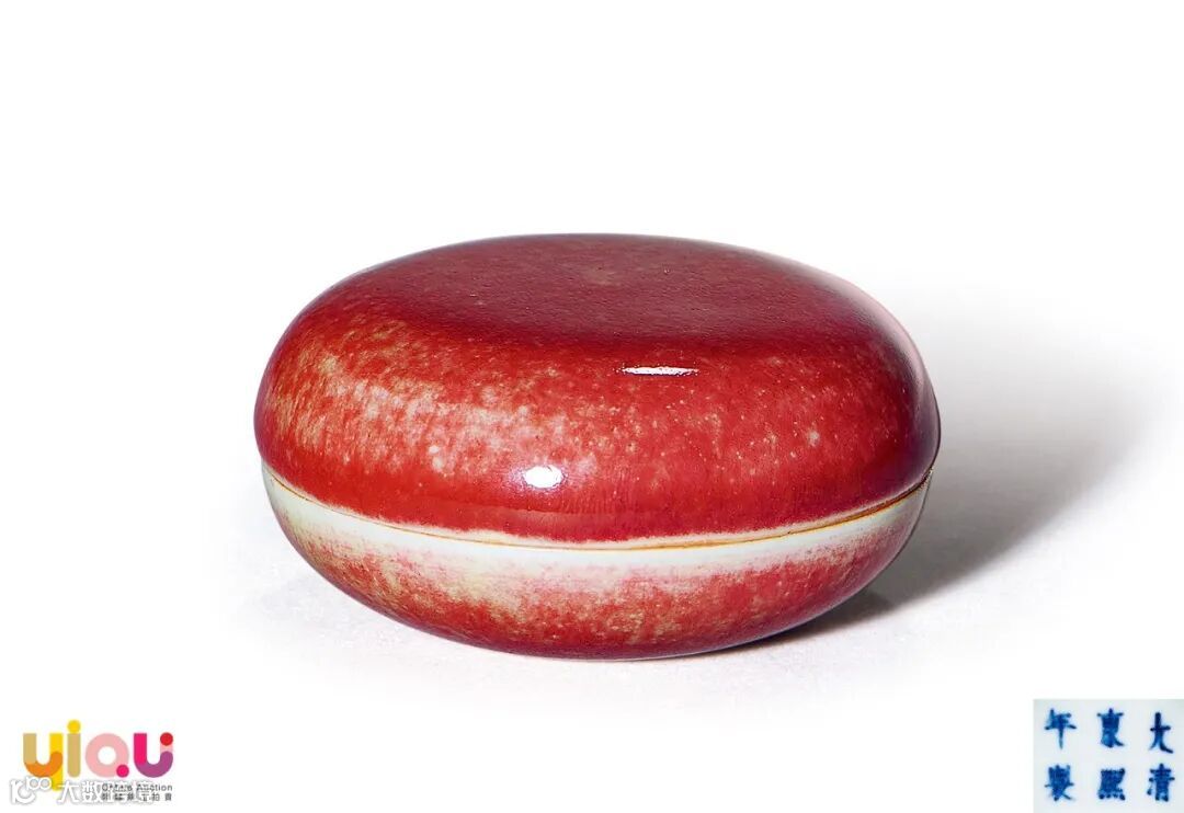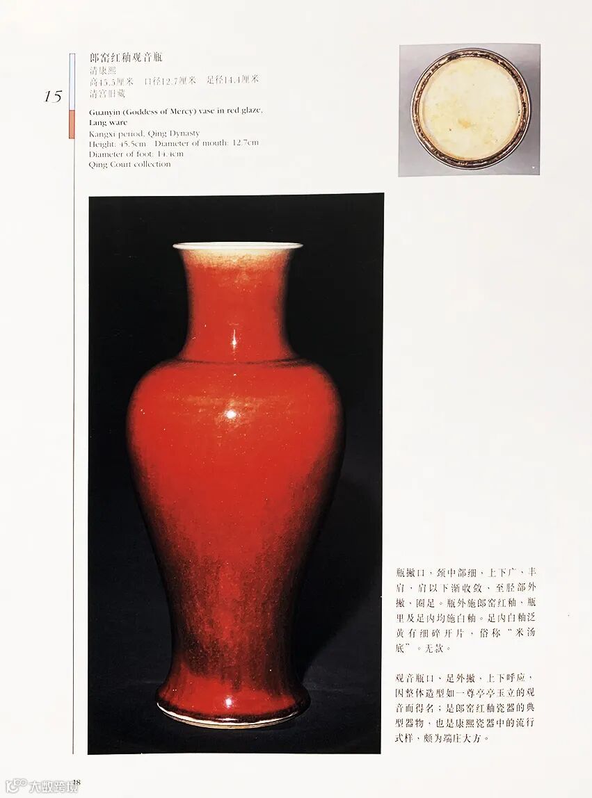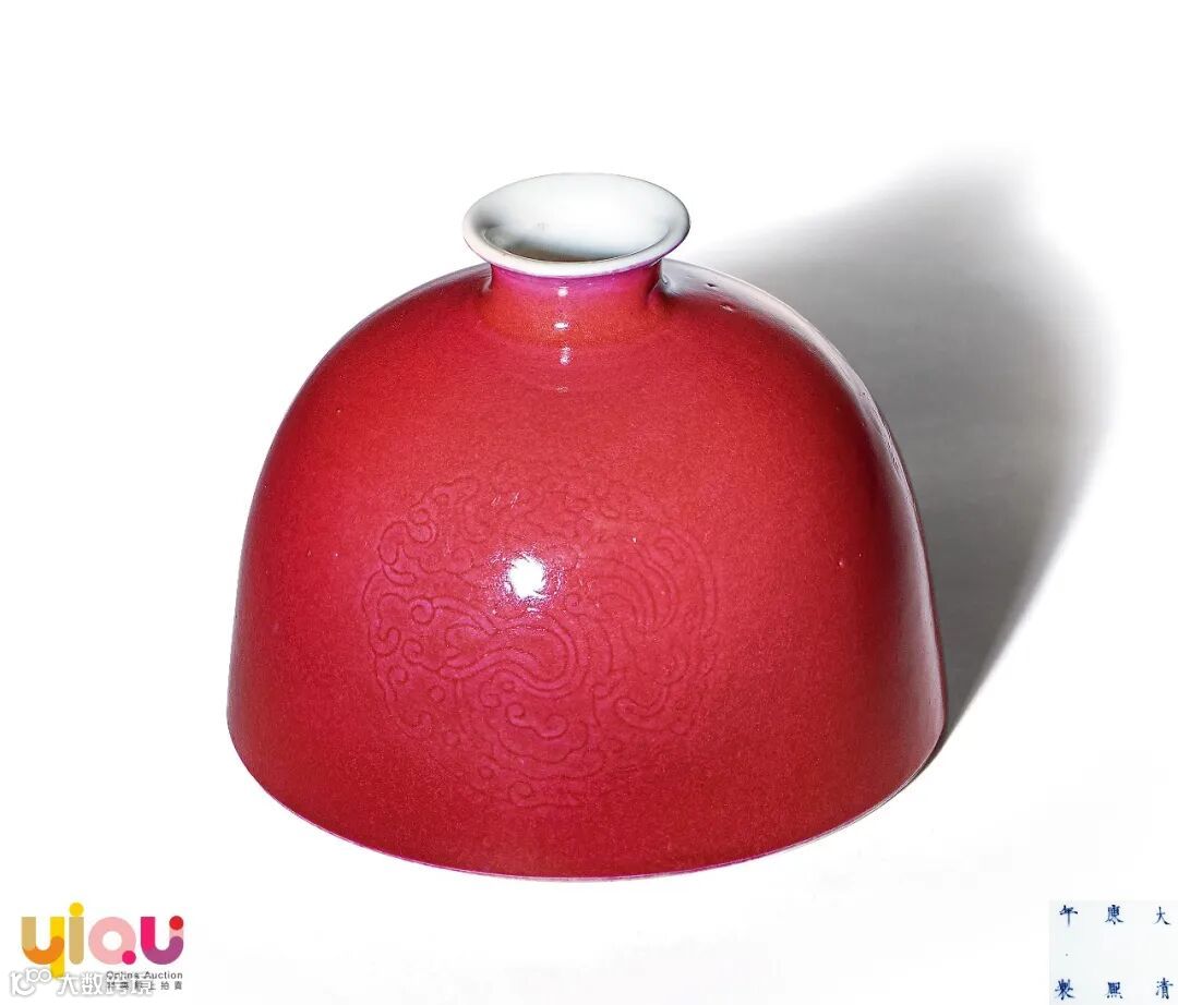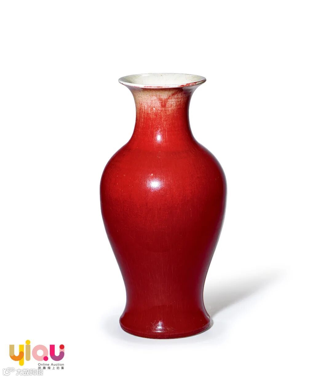 郎窑红釉为康熙时仿明宣德宝石红釉的品种,过去一直认为是郎廷极督陶时所烧,故名“郎窑”,其色如初凝牛血一般鲜红浓艳,乾隆御制诗中曾有“世上朱砂非所拟,西方宝石致难同”的吟咏,乃清代单色釉中的名品,一直为藏家所重。拍品是郎窑红釉瓷器的典型器物,外壁满施红釉,釉面现玻璃光泽,色泽均匀浓艳,整器造型秀美端庄,技艺精湛,堪称佳品。