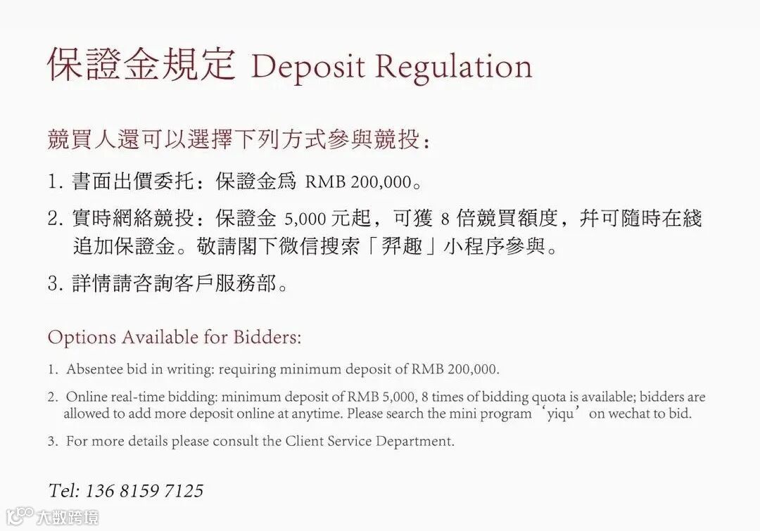 需要提前交纳人民币不少于 5000 元的保证金,按照 1:8 的比例使用,保证金余额不足亦可追加。保证金可以通过大羿拍卖小程序使用微信支付,由于微信保证金各银行转帐有限额规定,阁下亦可通过网上银行(限中国大陆境内银行)转账至北京大羿拍卖有限公司银行帐户。
