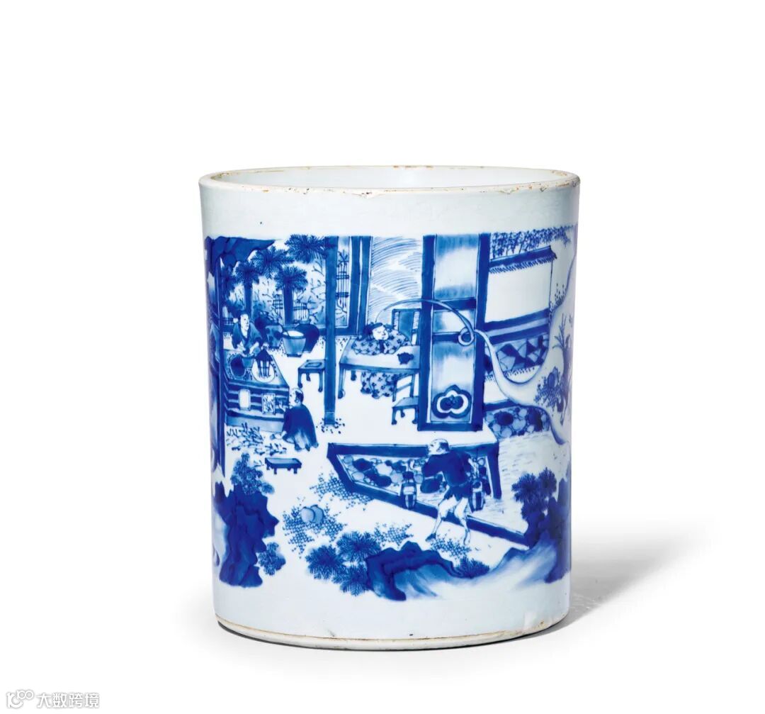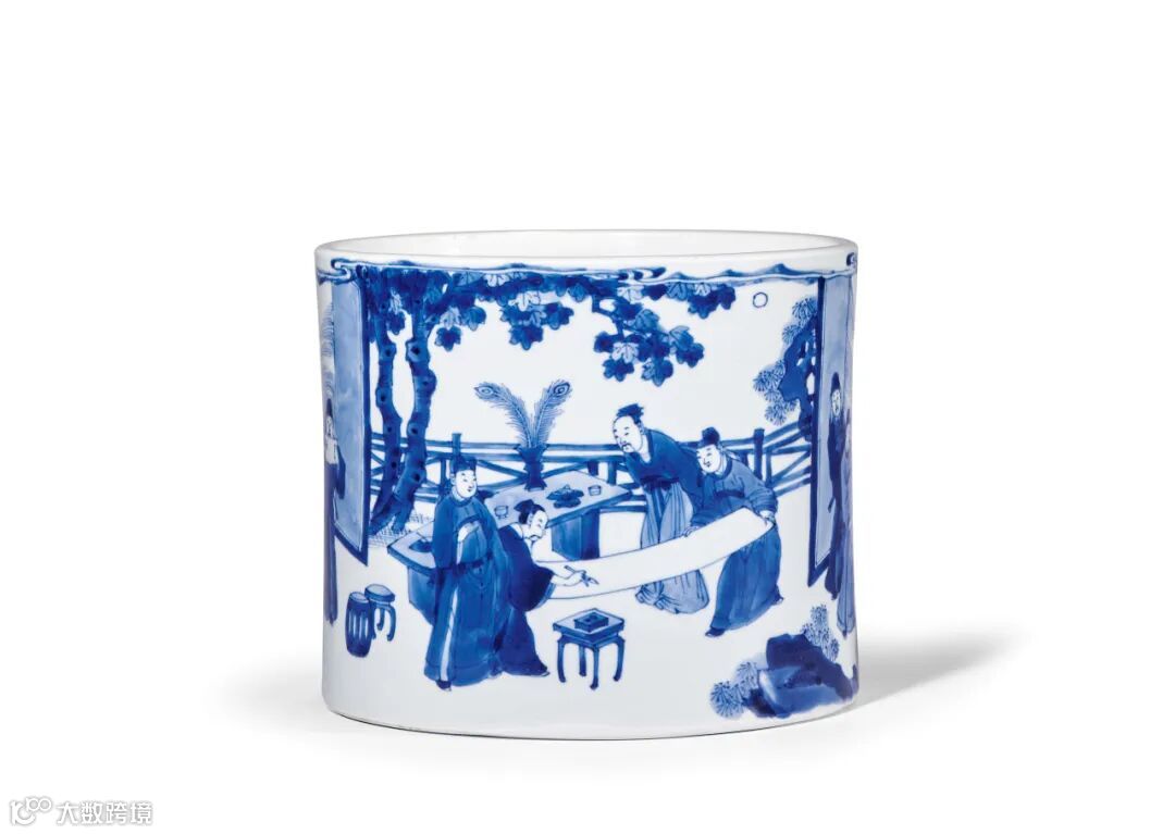 清康熙 青花“十八学士”图笔筒