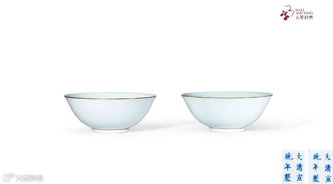 此对碗造型精巧秀丽,线条圆滑有度,胎质细腻坚实,釉面盈润透亮,碗壁内外满施白釉,口沿施金彩,器表光素无饰,突显白釉之纯净,釉色均匀洁净,气韵低调内敛,观之恬淡宁静,耐人寻味。宣统官窑瓷器烧造数量较少,拍品成对保存,较为难得。