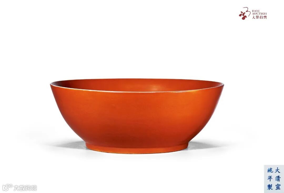 清宣统珊珊红釉暗刻莲池纹大碗尺寸硕大,造型端正规致,沉稳大气。器身施珊瑚红釉,色泽娇浓沉郁。碗身外壁浅刻莲花荷叶图案,荷花花瓣饱满盛开,荷叶分布高低错落,叶面翻卷,十分华美。碗内中心作圆形纹饰,中间绘宝杵图案,周围作中心对称花纹。宣统一朝历时仅三年大清王朝即告覆灭,故宣统官窑所制数量十分有限,此件大碗制作精细,十分罕见。北京故宫博物院收藏有相同藏品,其形制与本藏品完全一致。