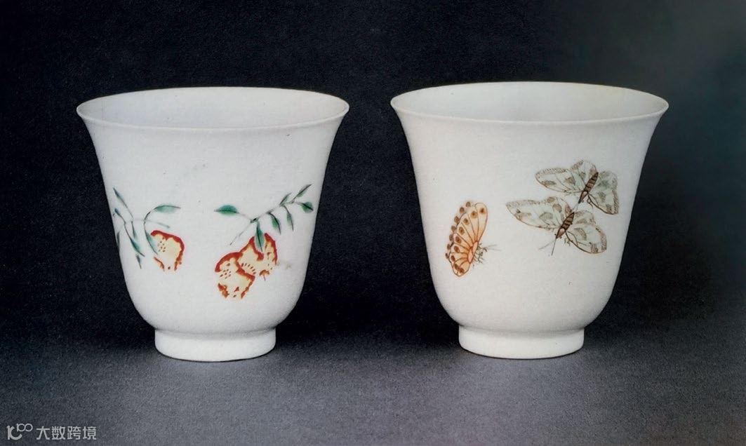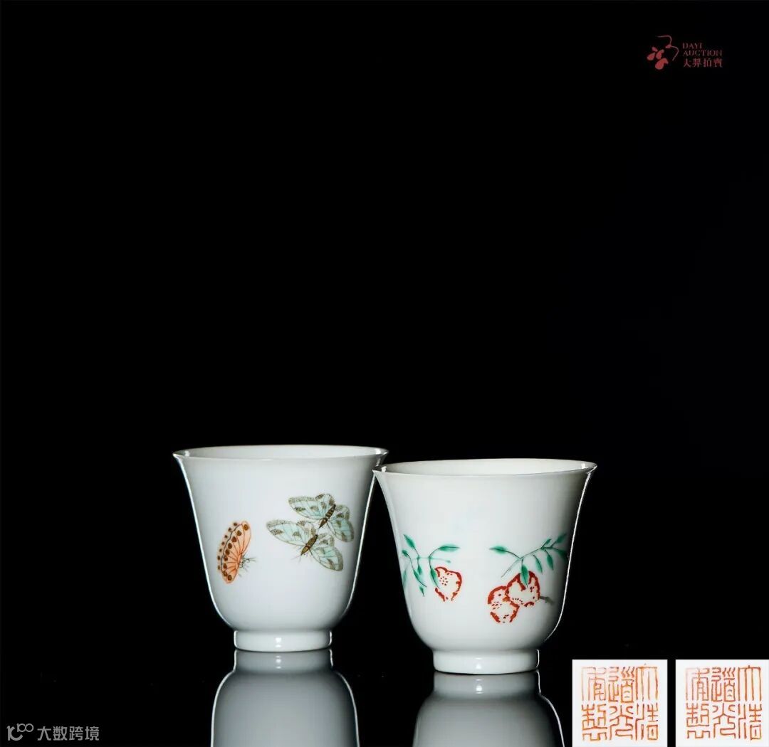 此对拍品造型规整优美,比例恰到好处。胎骨轻盈细薄,釉层莹白透亮,外壁一面绘折枝桃纹,果硕压枝,鲜妍诱人,枝嫩叶绿;另一面绘彩蝶三只,翩翩飞舞,轻盈飘逸。杯身彩色艳美厚实,绘画生动传神。