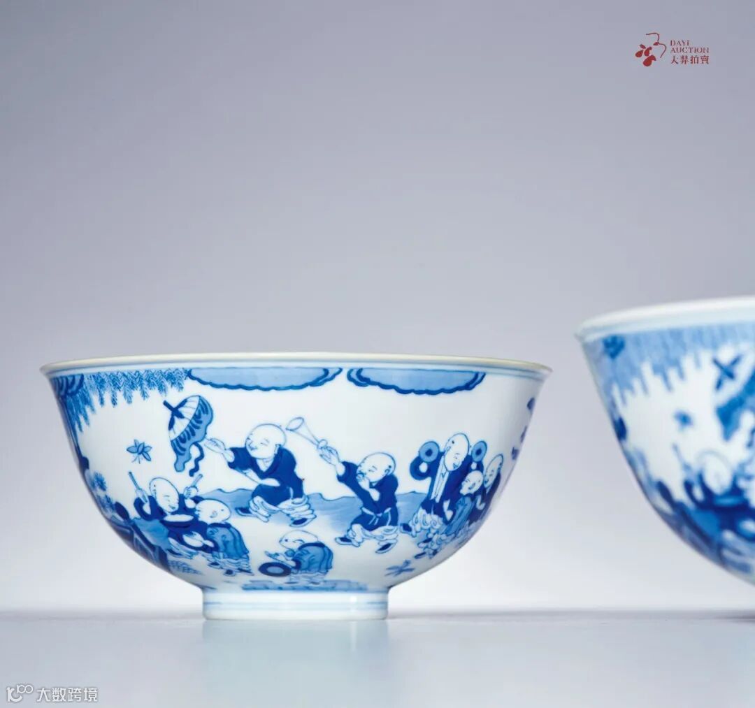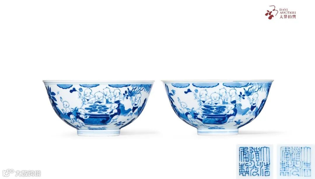 婴戏图亦称『童嬉图』,典出《诗经·大雅》,永宣时期开始运用于瓷器纹饰之中,寄托了古人祈求子孙繁衍昌盛之愿,因其寓意吉祥,遂从此成为历代官窑的经典纹样。婴戏图有四子、八子、十六子、百子等多个品种,其中以十六子婴戏图最为典型。此式青花婴戏图碗自乾隆朝成为清代御窑定式,延续烧造至清末。本品为道光所作,胎质细腻,釉色滋润,青花色泽富有层次,绘画细致传神,整体品质不输前朝,其烧造数量却更为稀少,且为成对流传,更值珍视。
