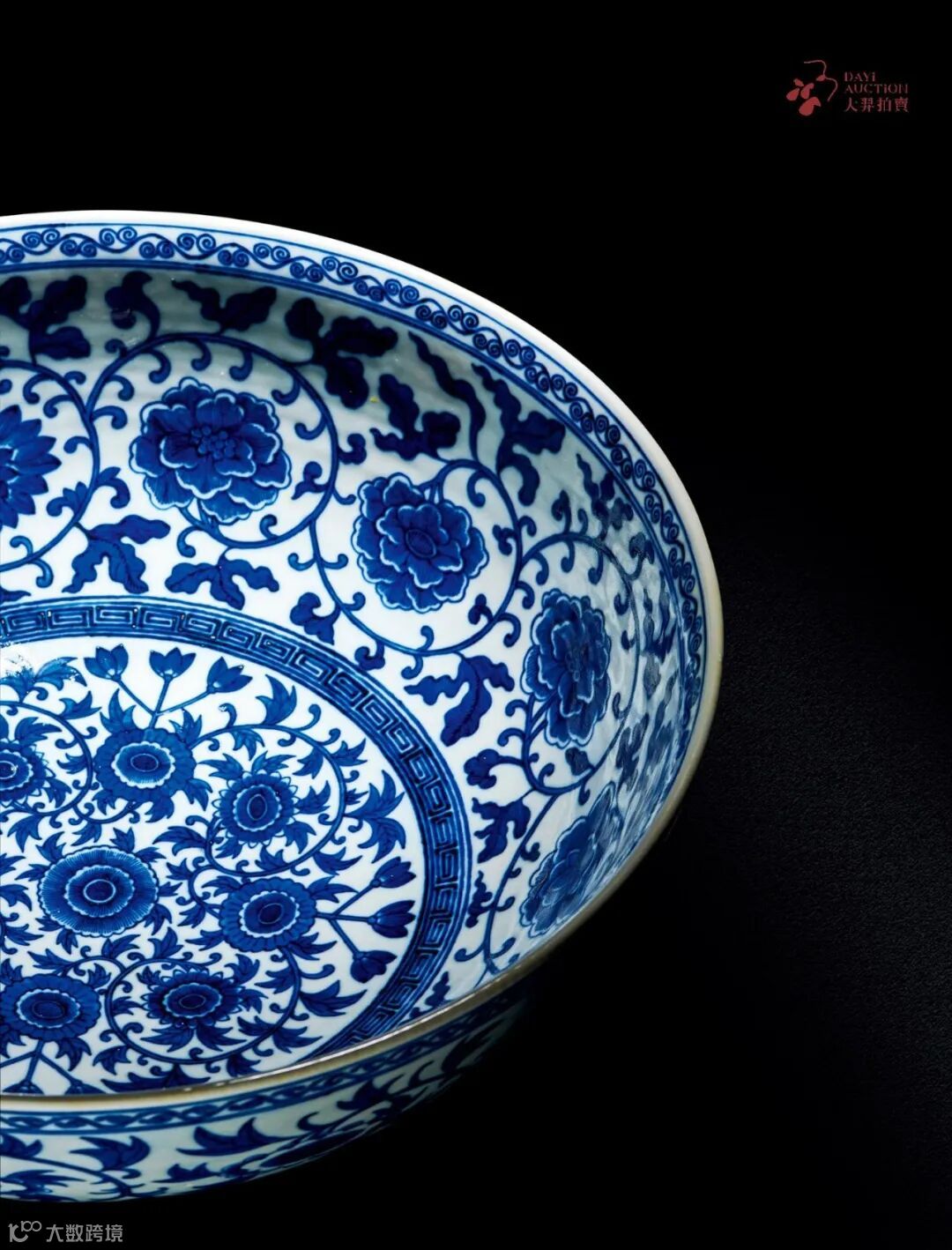 此碗体型硕大,气势雄浑。底书『大清光绪年制』六字双行楷书款,颇为少见。然清中期自道光以来,官窑制瓷质量每况愈下,与前朝已不可同日而语,咸丰年间,御窑厂毁于战火。『同治中兴』之后,御窑厂恢复生产,且吸收了很多民间工艺名匠加入创作,故同治、光绪两朝的官窑作品质量有所恢复,尤其在艺术风格上表现出『维新』、『变法』的独到之处。清宫亦有口径达54公分之大碗,称为冰碗,为夏日盛放冰块,作消暑纳凉之用,由此推断,此碗或为光绪官窑特制用作相同功用亦未可知。