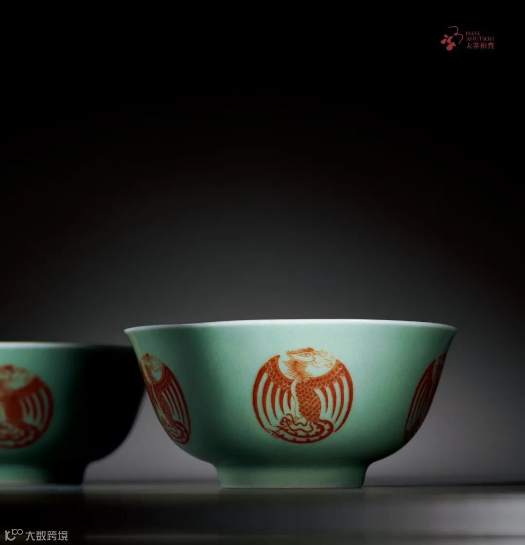 此对拍品敞口,深弧腹,圈足。通体施以豆青釉,碗壁用矾红绘制五组团凤纹,凤鸟展翅,凤目尖喙,羽丰尾长,仪表威仪。矾红是陶瓷低温釉上颜料,明代嘉靖时,御器厂以矾红釉取代铜红釉。到清乾隆时,矾红的制作技术有了很大的进步,色泽鲜艳,华丽凝重。此对碗造型端庄稳重,图案规整,绘画生动,釉色纯正,与纤细的纹饰相衬,分外脱俗,寓意吉祥,是艺术及历史价值极高的收藏品。