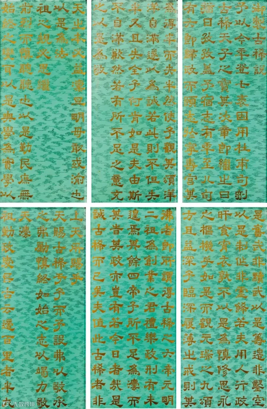 瓷板一组六屏,每屏宽25厘米,高近2尺,总长达3米,尺幅恢弘壮观。施以吉翠松石绿釉为地,匀净厚润,色泽雅致,其上以金彩描绘迤逦祥云,遍布全体,犹如皇帝御用笺纸一般,富丽堂皇。祥云之上阴刻《御制古稀说》诗文,并填以金彩,笔法稳健,古拙沉雄,流露出凝练苍朴的金石趣味。全器装饰华丽而不失文雅,金彩诗纹在松石绿釉的衬托下愈显璀璨辉煌,色彩搭配精致,文字布局规整,体例考究,皇家气息浓厚,是一件尊贵的乾隆时期宫廷陈设大器。