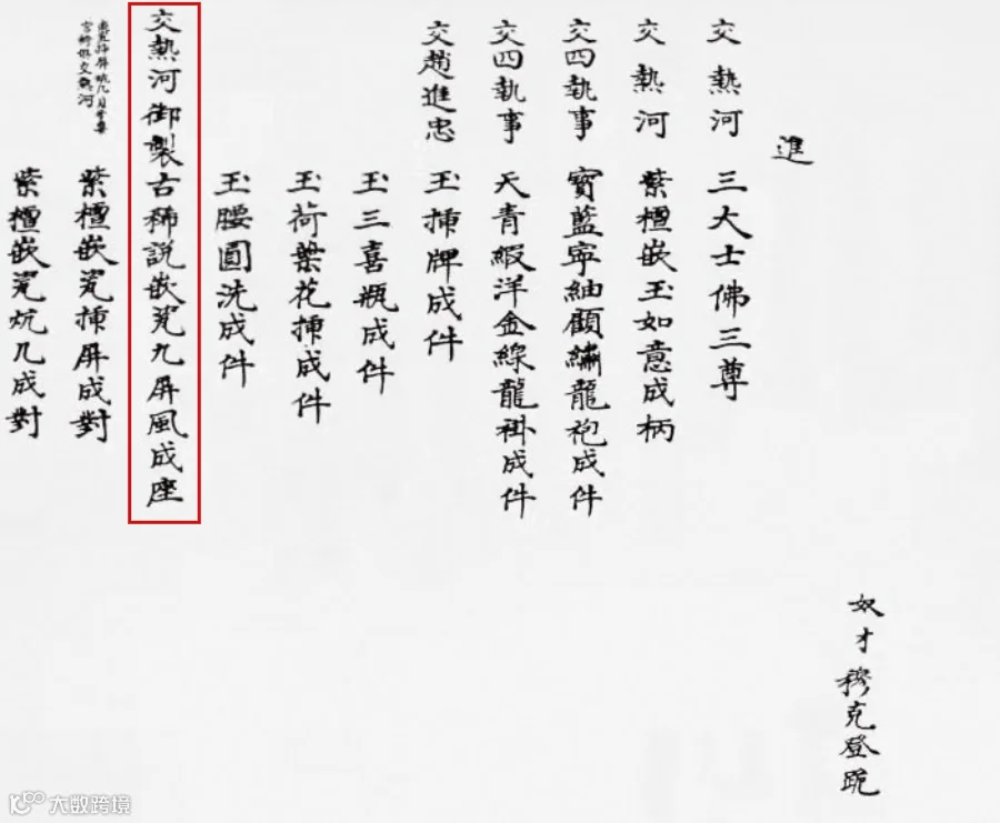 乾隆四十六年七月十三日江蘇巡撫閔鶚元《进单》:“恭進:……(交熱河)製古稀説紫檀鑲嵌炕挿屏成座……”。