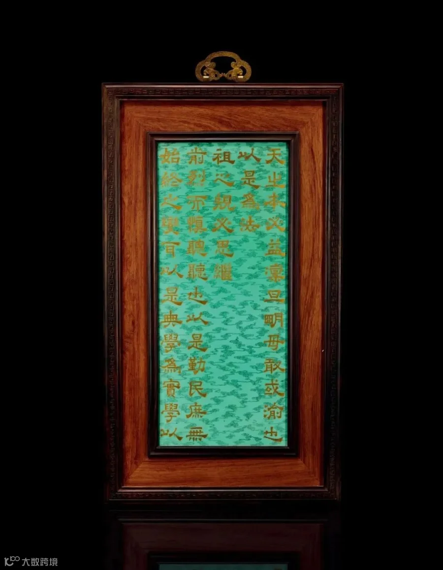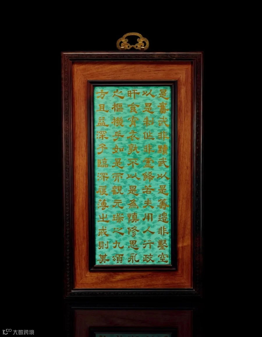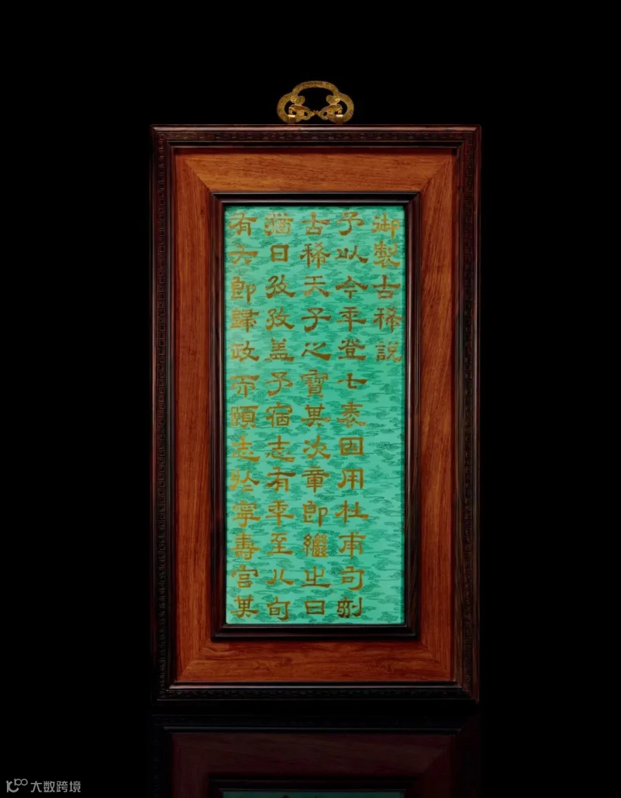 乾隆晚年这篇杰作,与此件瓷板巧妙的结合在一起,使得二者相得益彰。瓷板比例协调,尺幅恢弘,松石绿釉与金彩搭配得当,庄严肃穆亦有华丽之感,金色的御制文似跃然而出,光灿夺目,使整器饱具皇家特色。拍品是一件极难得的清宫陈设佳器,具有极高的收藏价值,想必这也是张氏父子念念不忘的原因。