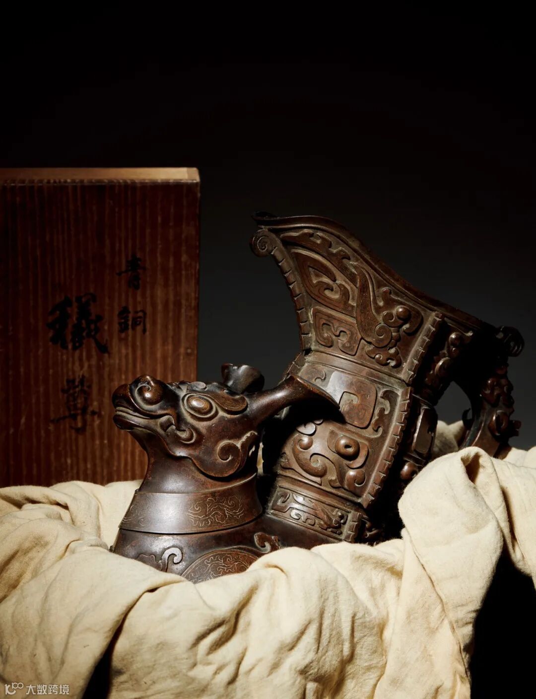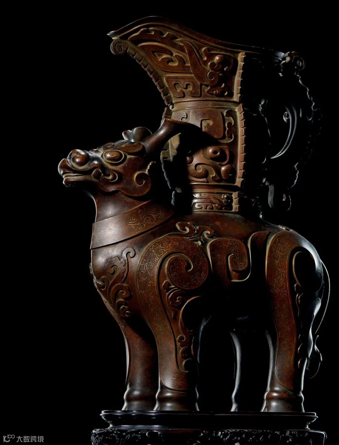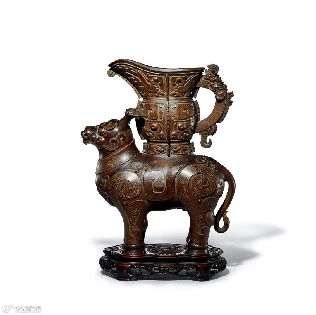此尊精铜为材,体型硕大,入手沉重。牺首正视前方,双耳直立,双目炯炯有神,身躯丰满坚实,四肢粗壮,强健有力。牺身驮负『觥』形尊与中空的樨腹相连。牺脸部、颈部及身体均镶嵌金银丝花纹为饰,金银丝线镶嵌完美,填划曲线自然生动,技巧高超精湛,磋磨光滑平润。全器皮色细腻如蒸栗,包浆温润,造型源自经典,生动逼真,稳重中又添活泼之气,为清乾隆时期仿制青铜器之上乘佳作,不可多得。配有清代红木座及日本旧包装。