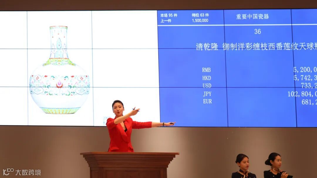 明清两朝的御窑精品场上竞争异常激烈。LOT36清乾隆 御制洋彩缠枝西番莲纹天球瓶,诸彩绚丽浓妍,绘画细致规整,工艺精湛绝伦,为乾隆御窑中的特殊品种,十分罕见。买家热烈响应,从一举槌开始,就呈现出你追我赶的激烈态势,气氛热烈,经过数轮叫价,以598万元顺利成交。