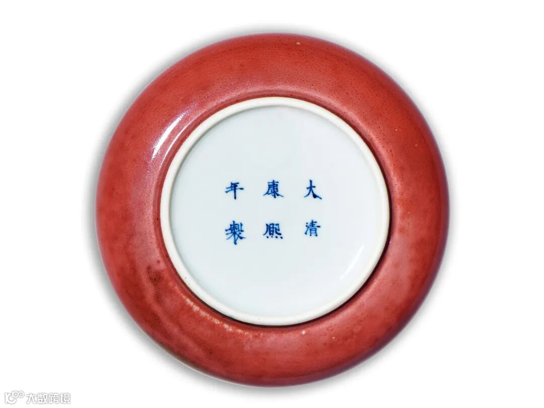 豇豆红为康熙红釉中最名贵的品种,因釉色似豇豆而得名。由于所施铜红釉敏感易变,经常呈现不同的釉面变化,按色泽深浅及斑块大小不同,有“大红袍”、“美人醉”、“娃娃面”、“桃花片”等不同美誉。《饮流斋说瓷》中称“美人霁佳处在于淡红中显鲜红色与茶褐色之点,背光则显绿色”豇豆红釉烧造难度很大,专供宫廷御用,因此极为珍稀。此镗锣洗无论从造型、品相、发色均堪称同类器形中的上品。