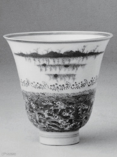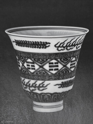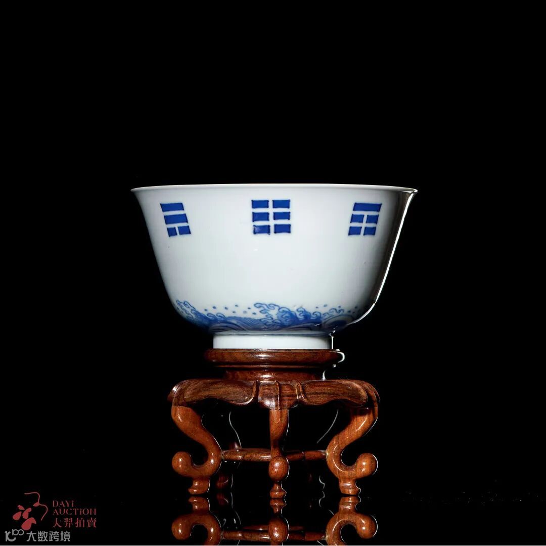 本品敞口外侈,钟形深腹,小圈足。胎体轻薄,造型小巧怡人。胎体轻盈灵动,青花发色极为完美,绘制意境空灵悠远,此等佳作,深具收藏价值。故宫博物院藏有造型完全相同,但装饰八卦纹的作品,可兹比较。