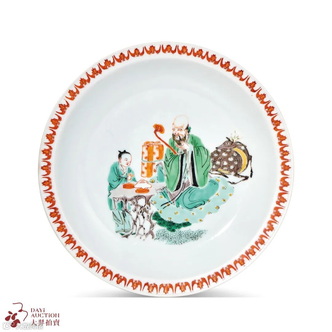 通体施白釉,白中闪青,釉面洁白光润。盘内中心,饰仙鹿寿老献寿图,寿老怀抱矾红绘制的如意,后有侍童相随,仕童旁置一随型几,几上置一仙炉,旁有仙鹿,省去常规的山峦起伏,茂树林立,云雾缭绕的图案设计,仅在盘心仅绘寿老祝寿之景象,亦然一派壮观跃然瓷上。整体绘画构图生动,利用了中国传统绘画以白代实的绘画风格,色彩绚丽,绘制精细,人物姿态生动,衣饰细节毫微毕现,极为精致,完全体现了康熙瓷器的高水平制作为不为多见。