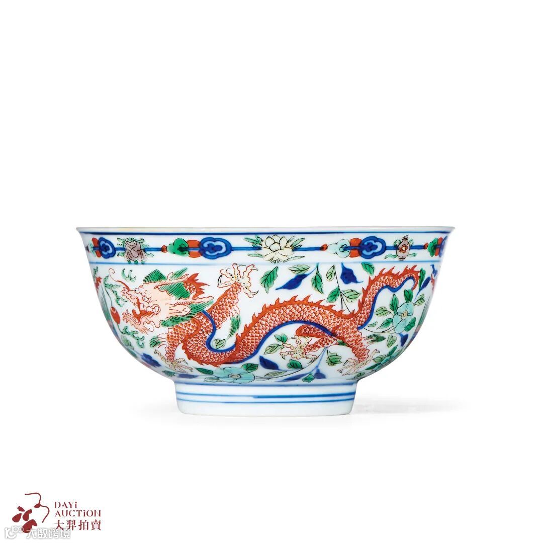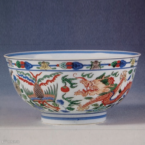 碗外壁口沿绘一周结带八宝纹,间饰青花、红、绿三彩的如意纹,腹壁绘两组龙凤戏珠纹,空隙处饰火珠及缠枝花卉纹。碗心青花双圈内绘戏珠立龙纹。纹饰描绘繁缛精细,施彩浓重艳丽,十分喜庆。底部青花双圈内书“大清康熙年制”六字双行楷书款。