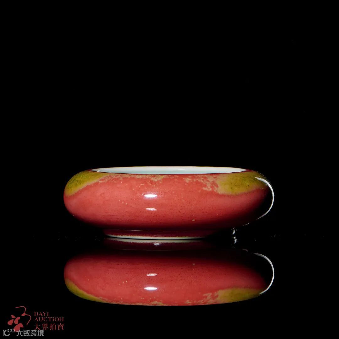 镗锣洗也为康熙朝新创的文房名品,传世品见有豇豆红釉、天蓝釉品种,其中以豇豆红釉最为著名。拍品与故宫博物院藏品品种相同,敛口,扁圆腹,器形规整,外壁满施豇豆红釉,釉面莹润,耐人寻味。