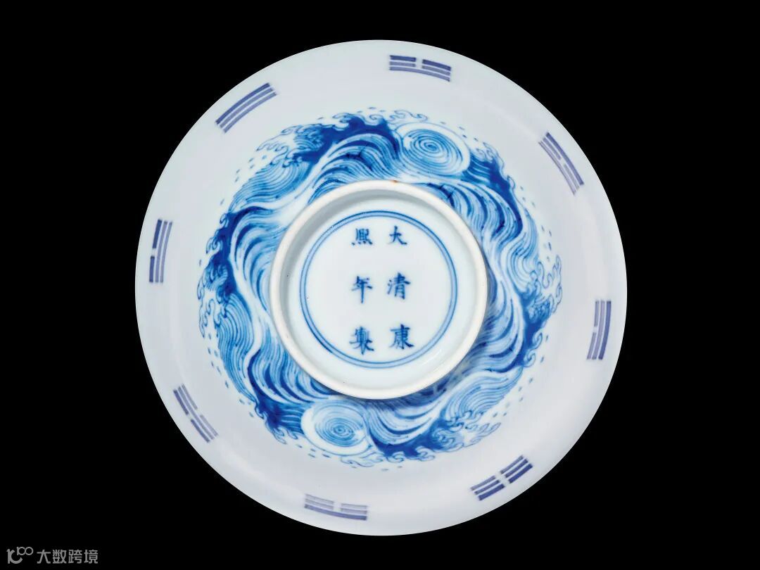 康熙一朝瓷器效仿嘉靖风格者也颇为常见,太极和八卦图形在明代嘉靖时期景德镇瓷器上十分流行,本品装饰虽简,却富有深意。外壁以青花绘制的海浪托八卦纹,笔法细腻,青花发色深浅相见,海水翻腾,活灵活现。碗内心有太极图与外壁纹饰呼应。底落“大清康熙年制”六字青花双圈楷书款。