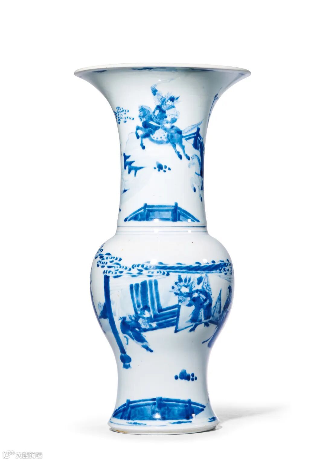 明末泰昌、天启、崇祯三朝官窑停烧,却给民窑生产带来了历史机遇,步入了一个兴盛的时期,从大量明末清初拍品来看,当时民窑瓷器的工艺水平已经不输嘉万时期制品,精者有的甚至超过了嘉万官窑产品。这个时期的瓷器一般不采用明代官窑规矩正统的纹样,而多以当时版画绘本为画稿,跳出了传统的瓷器纹样装饰的范畴,更多地将瓷坯当作绘画表现的载体。因此这一时期实用功能相对较弱的立件大量出现,甚至为了便于瓷绘,很多新器型干脆被设计成直筒型,如本场LOT33明崇祯 青花「郭子仪单骑见回纥」故事图筒瓶等。